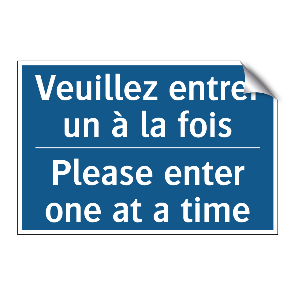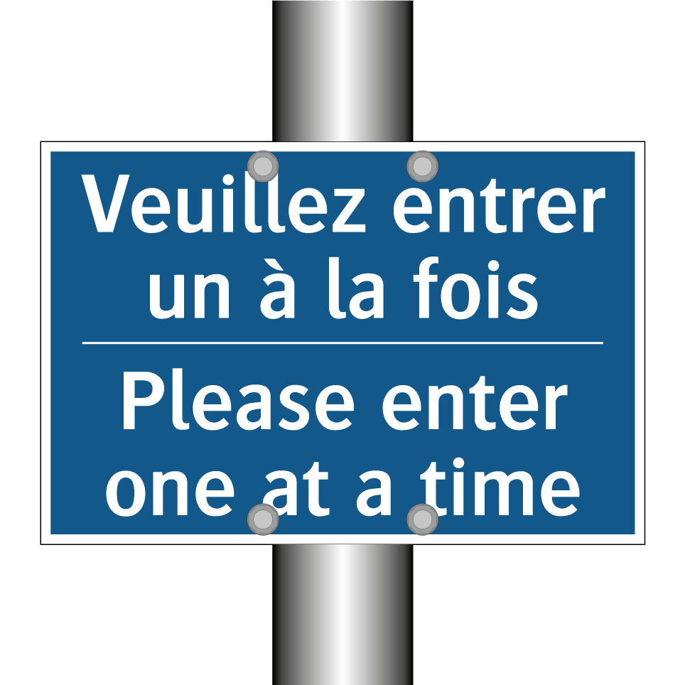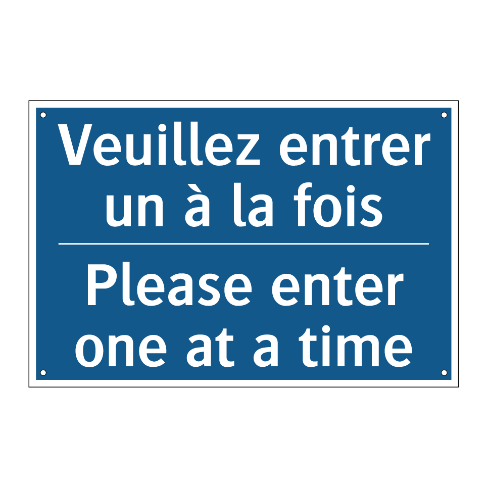 Panneau d'obligation bilingue avec texte en français : "Veuillez entrer un à la fois", et en anglais : "Please enter one at a time"