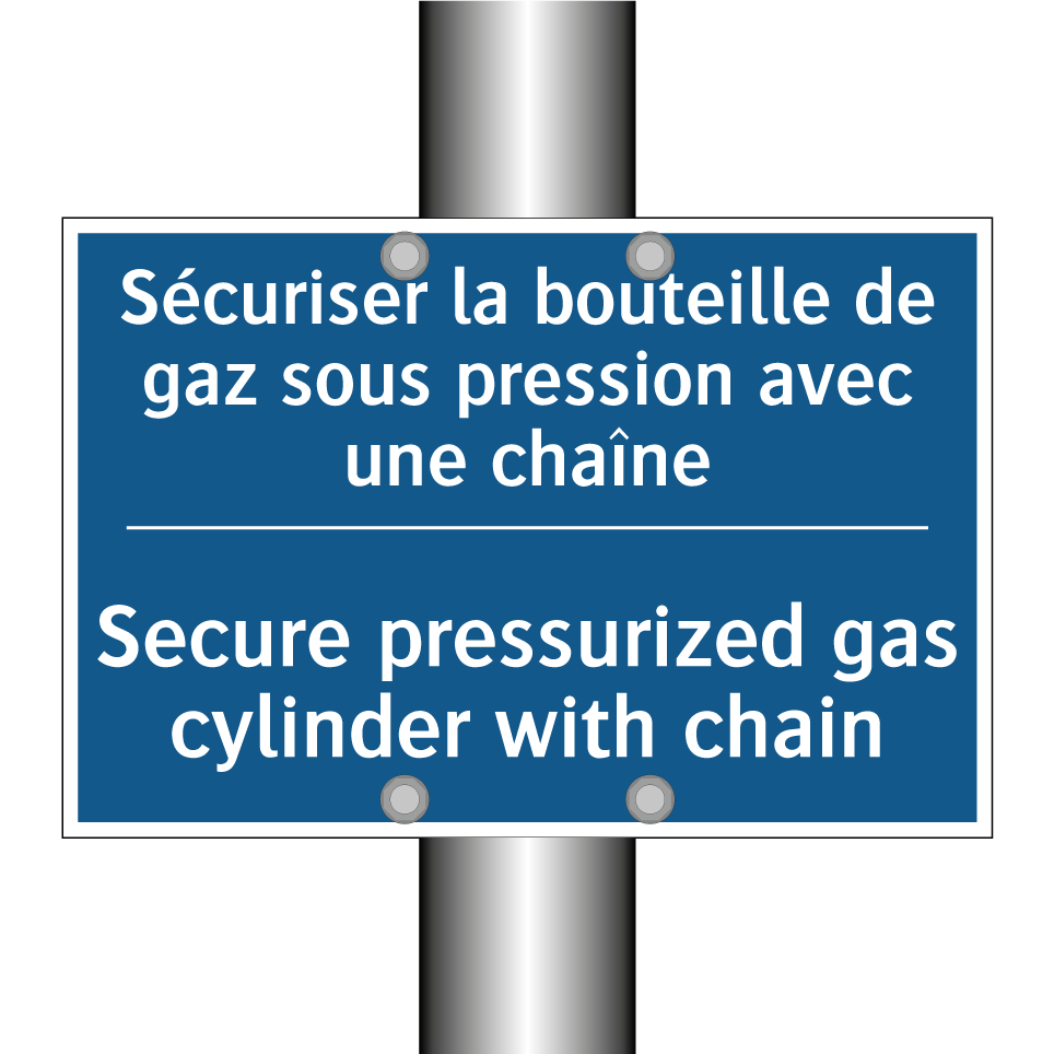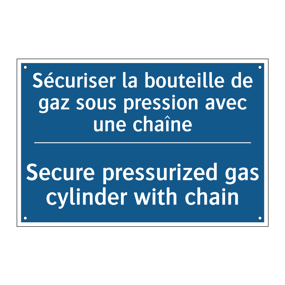 Panneau d'obligation bilingue avec texte en français : "Sécuriser la bouteille de gaz sous pression avec une chaîne", et en anglais : "Secure pressurized gas cylinder with chain"