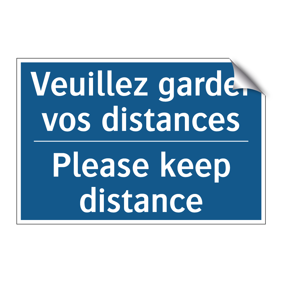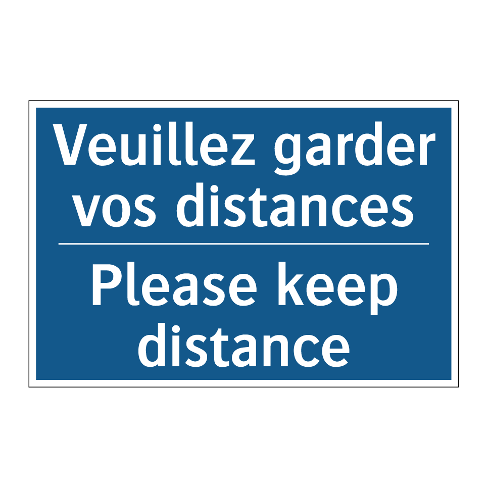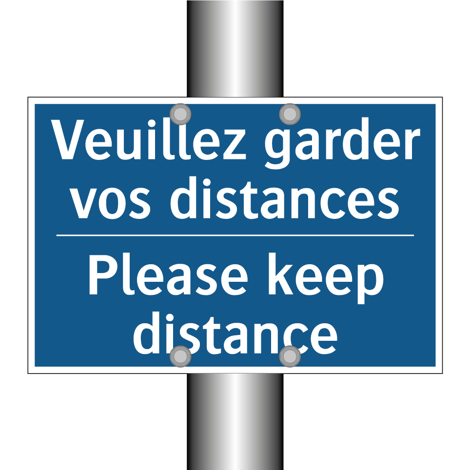 Panneau d'obligation bilingue avec texte en français : "Veuillez garder vos distances", et en anglais : "Please keep distance"