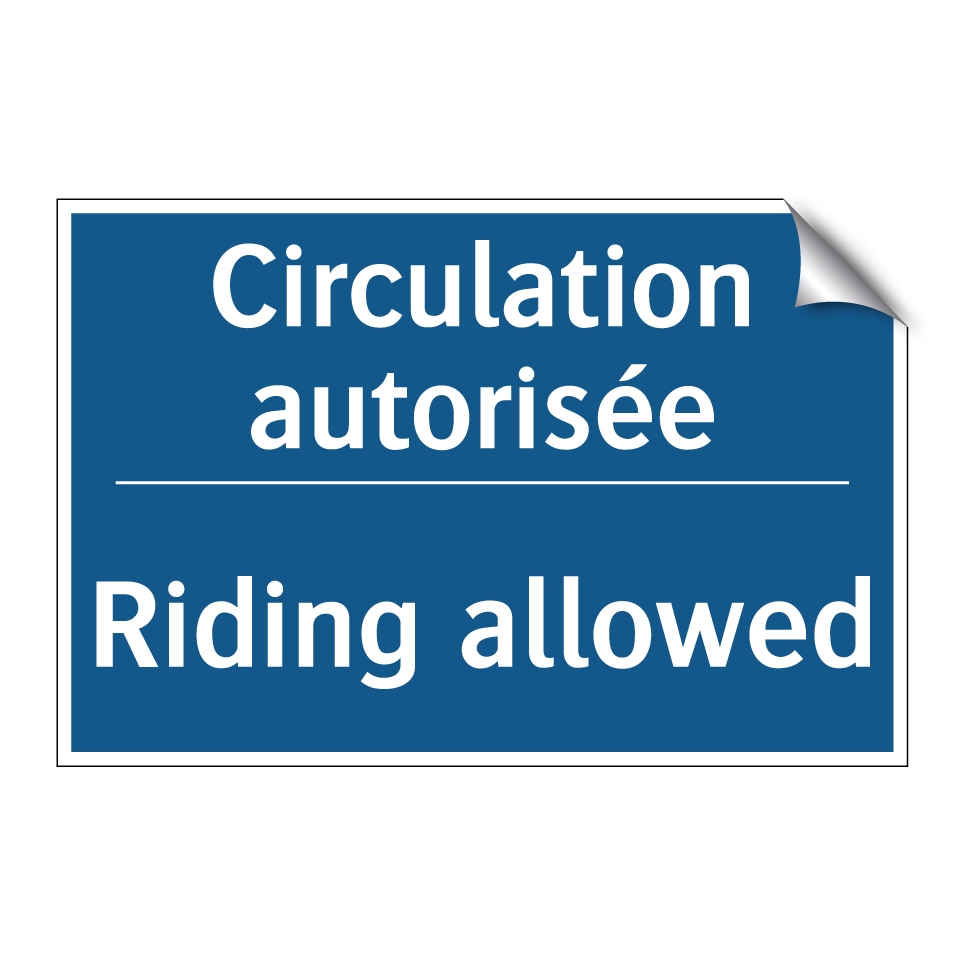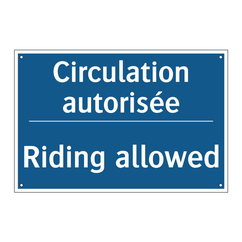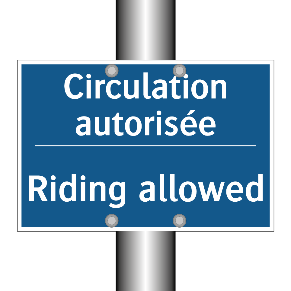 Panneau d'obligation bilingue avec texte en français : "Circulation autorisée", et en anglais : "Riding allowed"