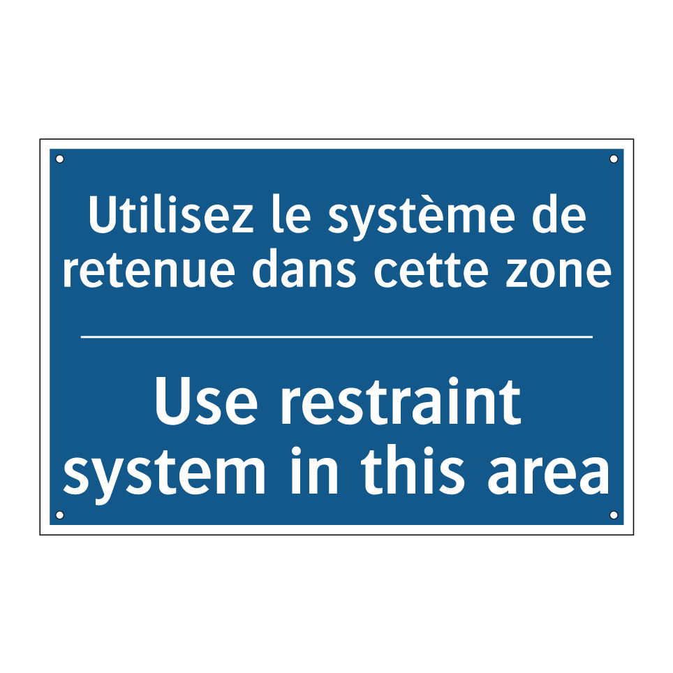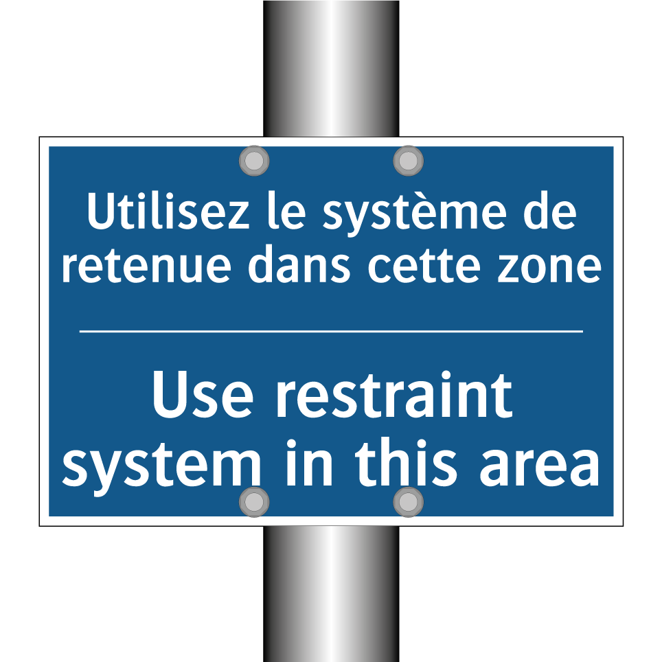 Panneau d'obligation bilingue avec texte en français : "Utilisez le système de retenue dans cette zone", et en anglais : "Use restraint system in this area"