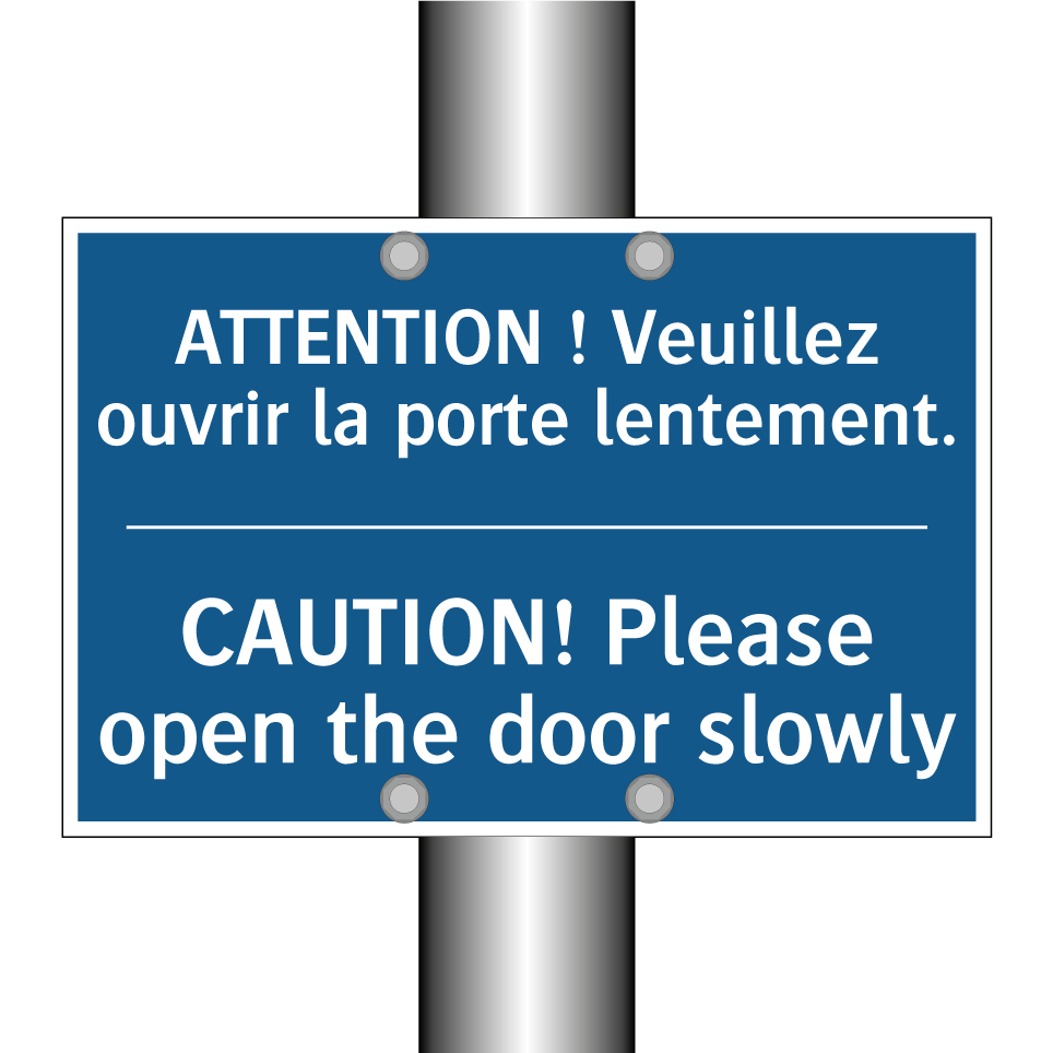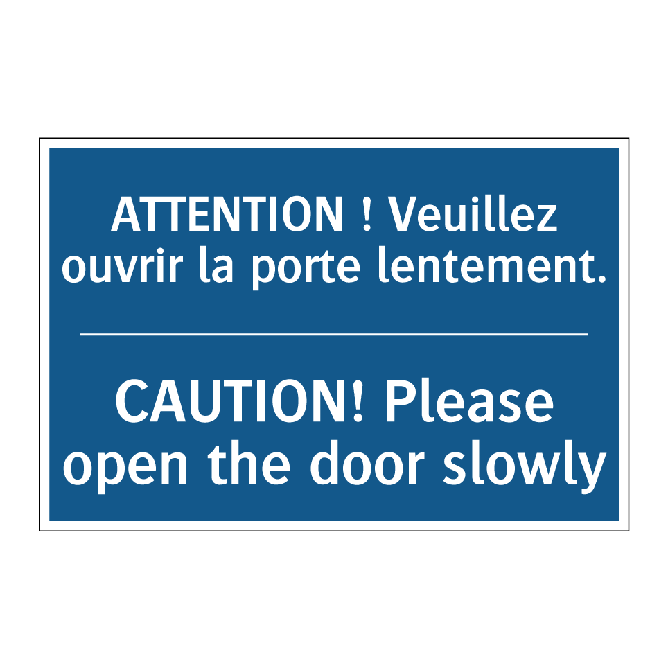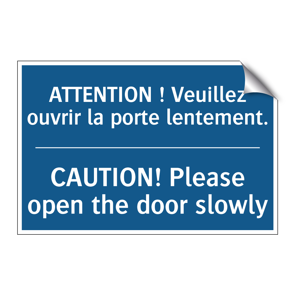 Panneau d'obligation bilingue avec texte en français : "ATTENTION ! Veuillez ouvrir la porte lentement.", et en anglais : "CAUTION! Please open the door slowly"