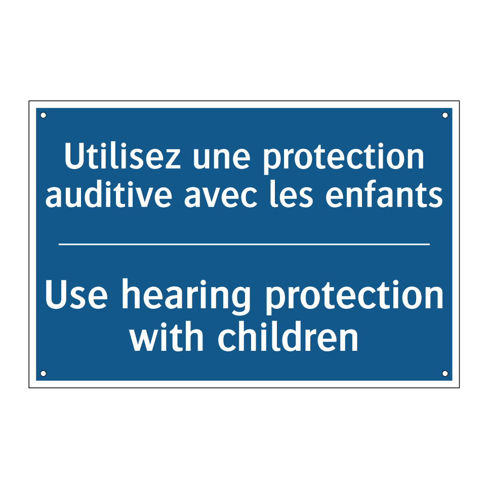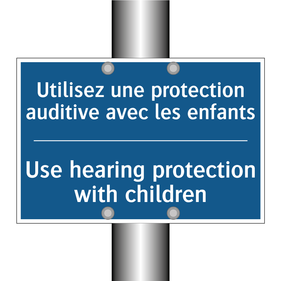 Panneau d'obligation bilingue avec texte en français : "Utilisez une protection auditive avec les enfants", et en anglais : "Use hearing protection with children"