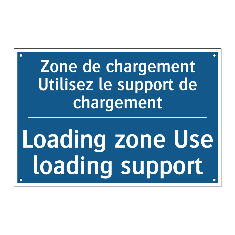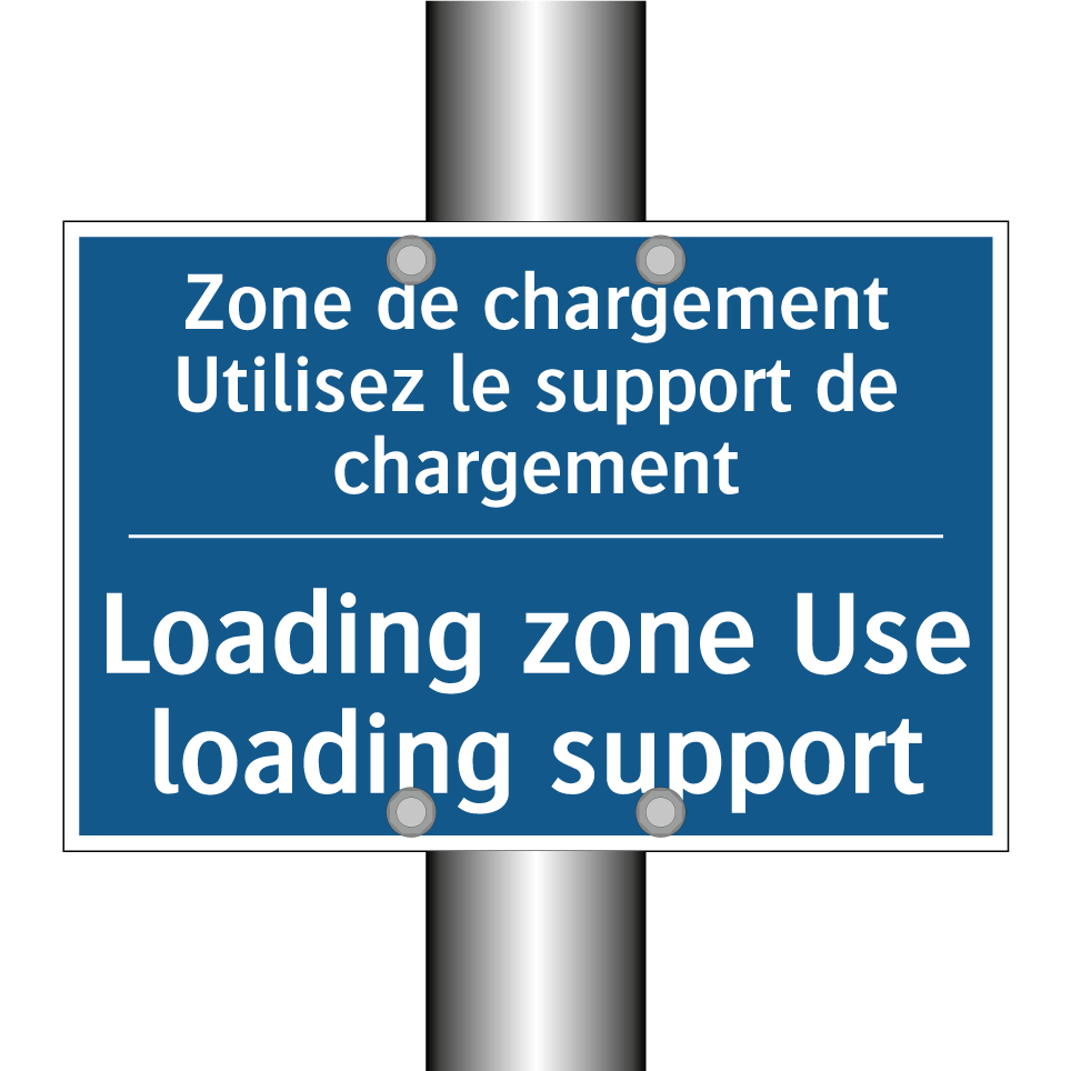 Panneau d'obligation bilingue avec texte en français : "Zone de chargement Utilisez le support de chargement", et en anglais : "Loading zone Use loading support"