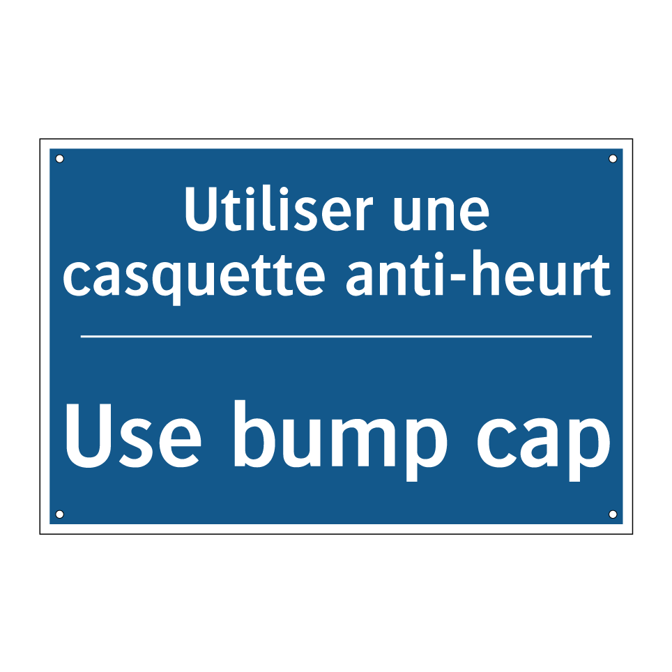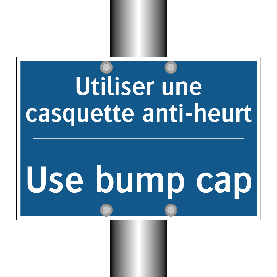 Panneau d'obligation bilingue avec texte en français : "Utiliser une casquette anti-heurt", et en anglais : "Use bump cap"