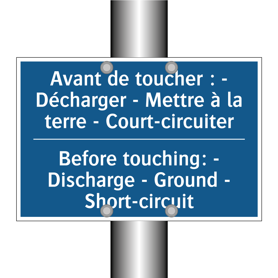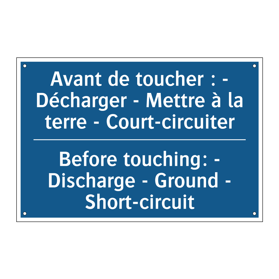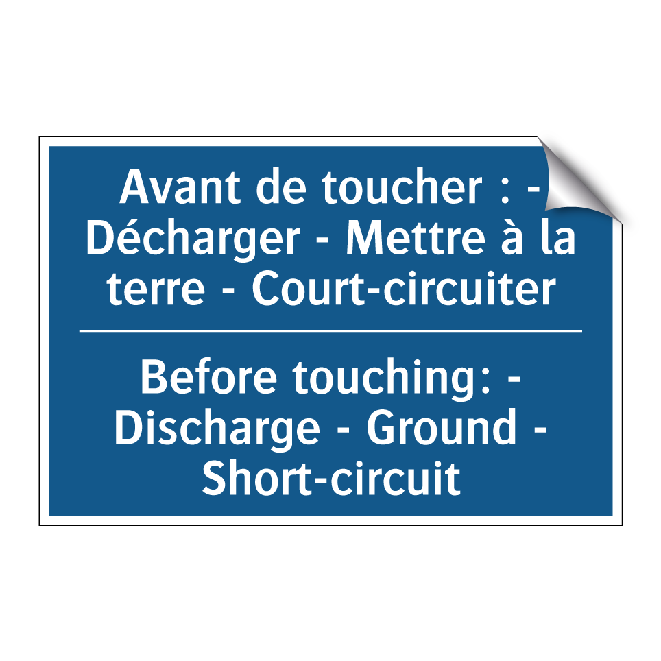 Panneau d'obligation bilingue avec texte en français : "Avant de toucher : - Décharger - Mettre à la terre - Court-circuiter", et en anglais : "Before touching: - Discharge - Ground - Short-circuit"