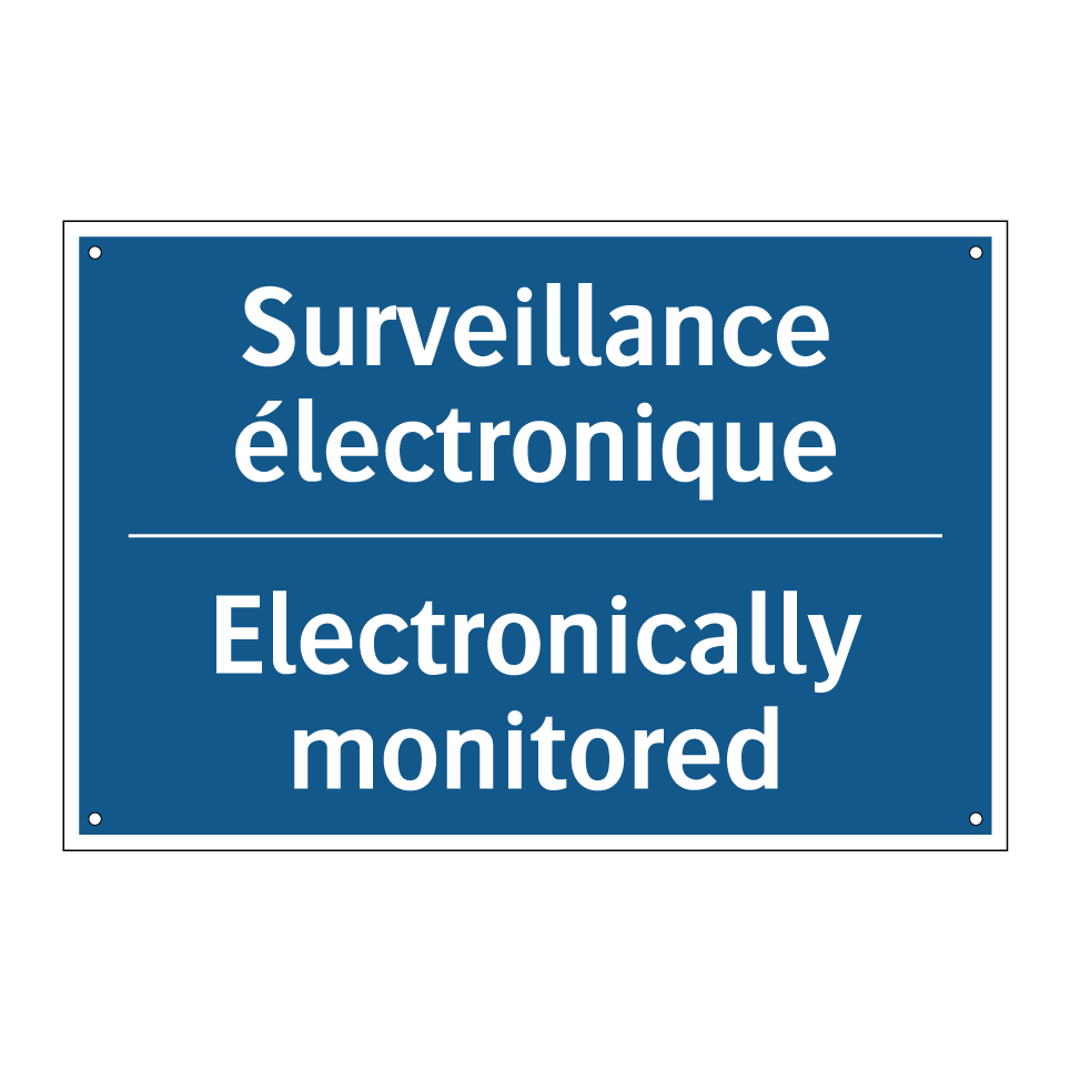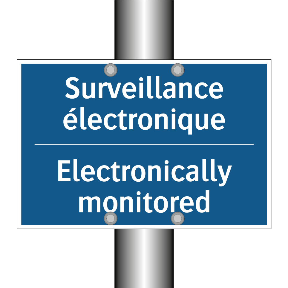 Panneau d'obligation bilingue avec texte en français : "Surveillance électronique", et en anglais : "Electronically monitored"