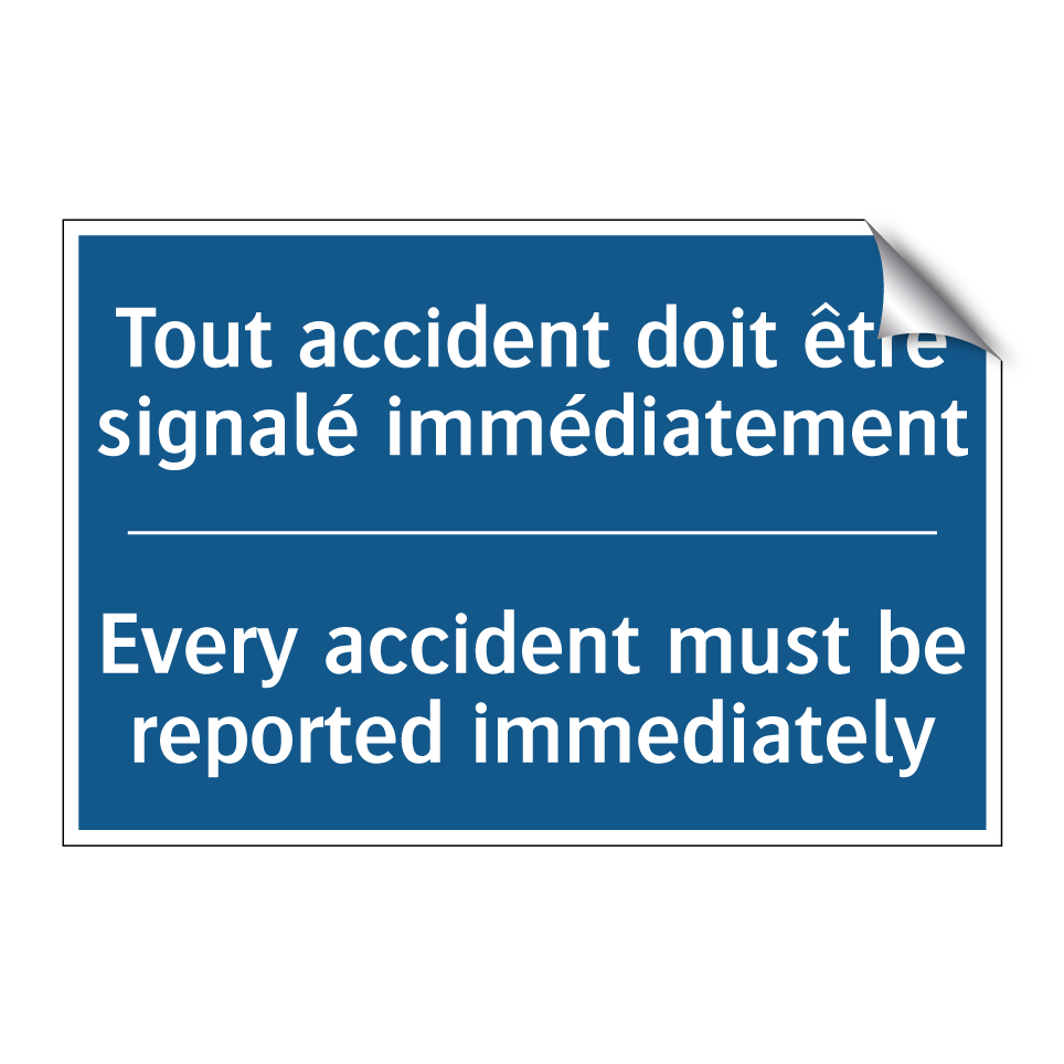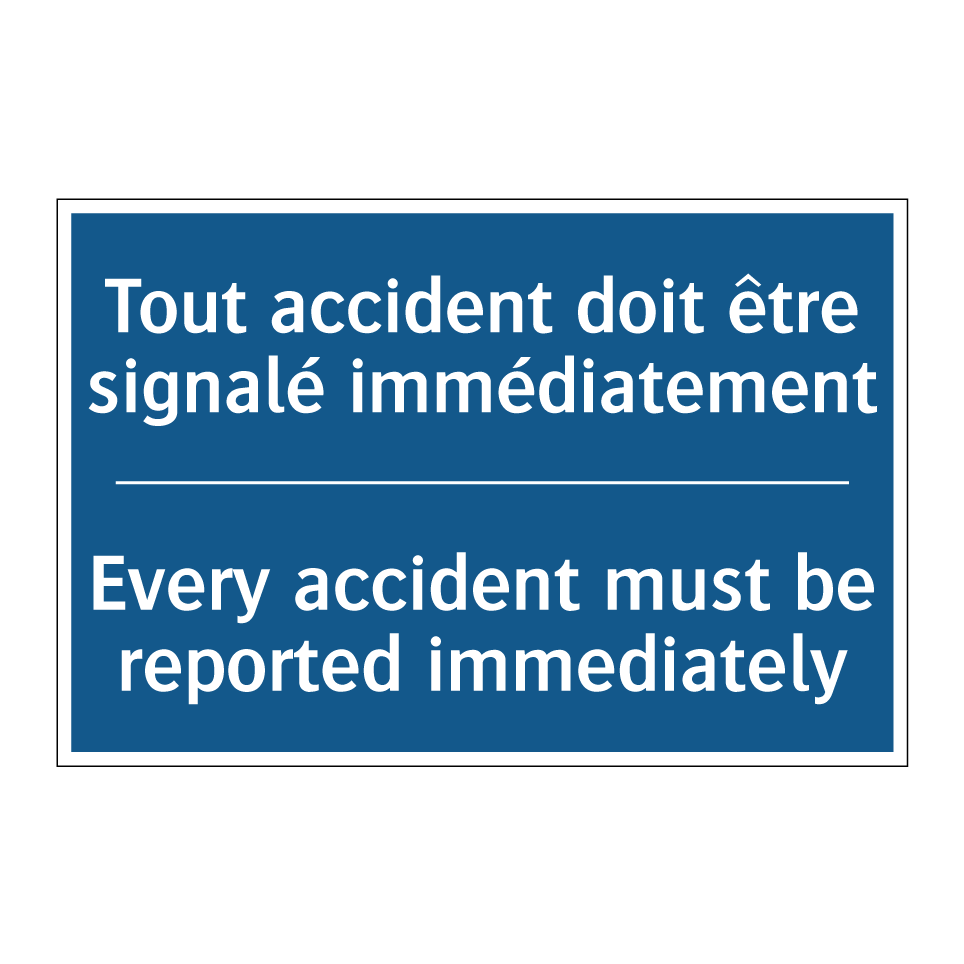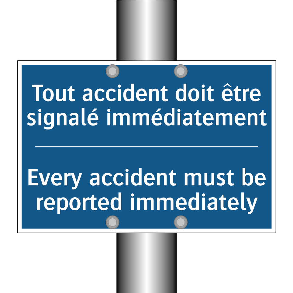 Panneau d'obligation bilingue avec texte en français : "Tout accident doit être signalé immédiatement", et en anglais : "Every accident must be reported immediately"