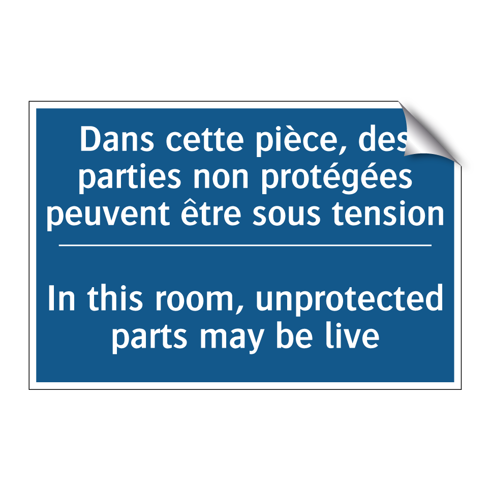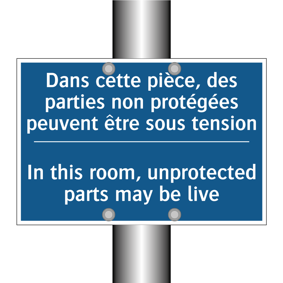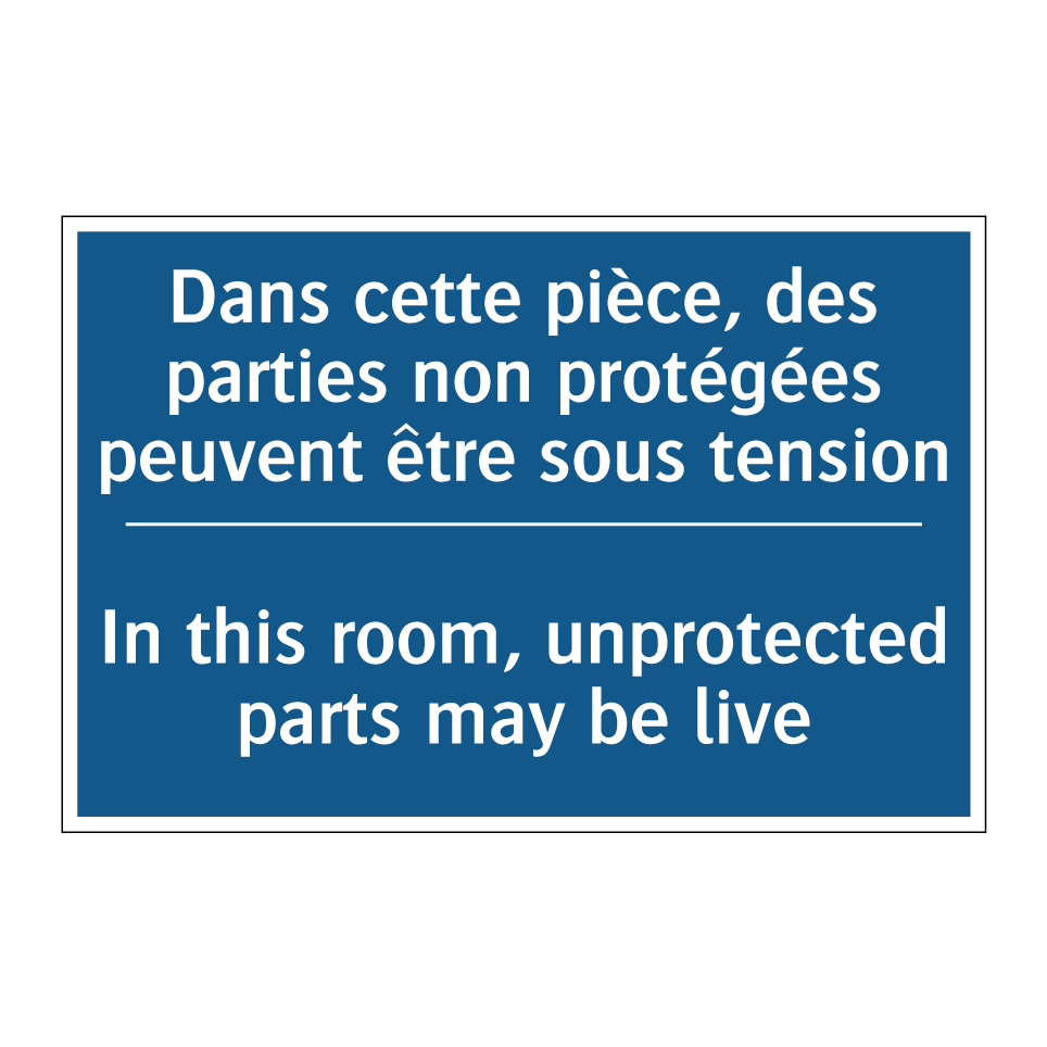 Panneau d'obligation bilingue avec texte en français : "Dans cette pièce, des parties non protégées peuvent être sous tension", et en anglais : "In this room, unprotected parts may be live"