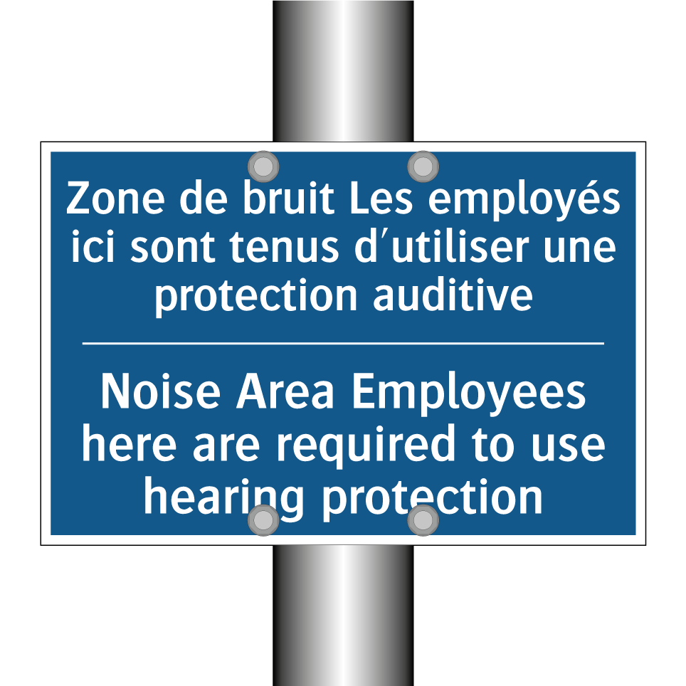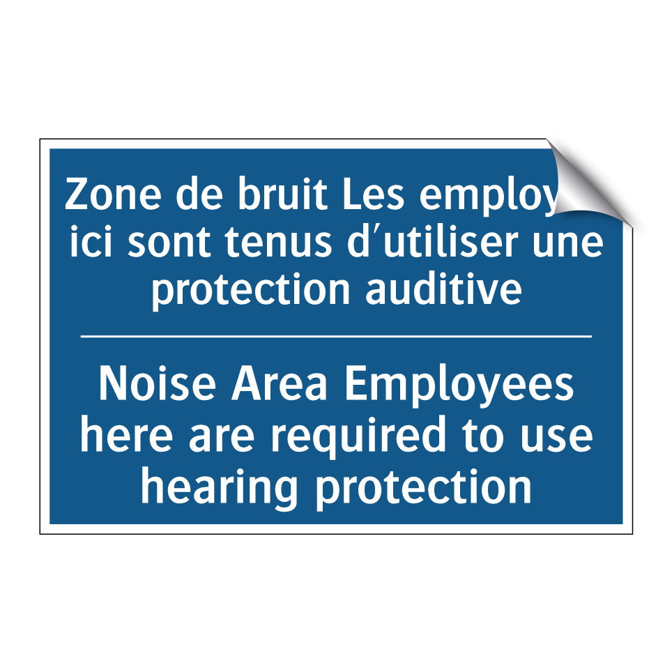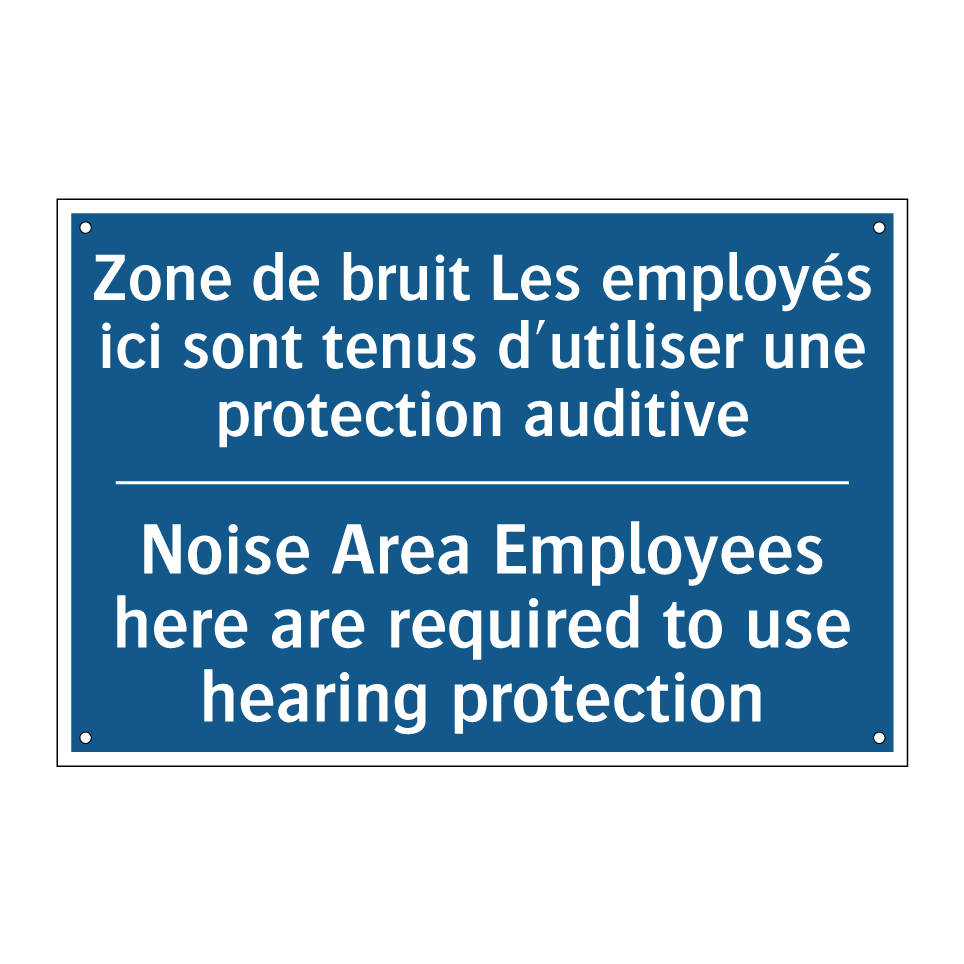 Panneau d'obligation bilingue avec texte en français : "Zone de bruit Les employés ici sont tenus d'utiliser une protection auditive", et en anglais : "Noise Area Employees here are required to use hearing protection"