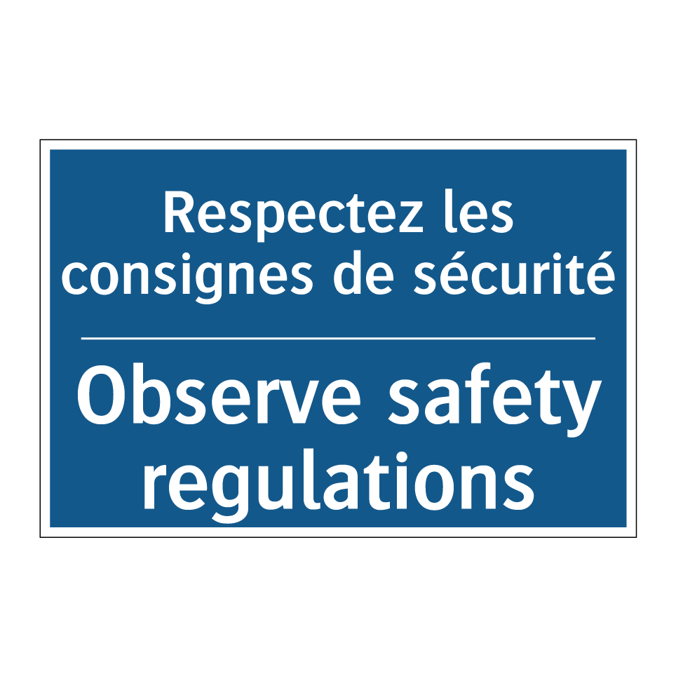 Panneau d'obligation bilingue avec texte en français : "Respectez les consignes de sécurité", et en anglais : "Observe safety regulations"