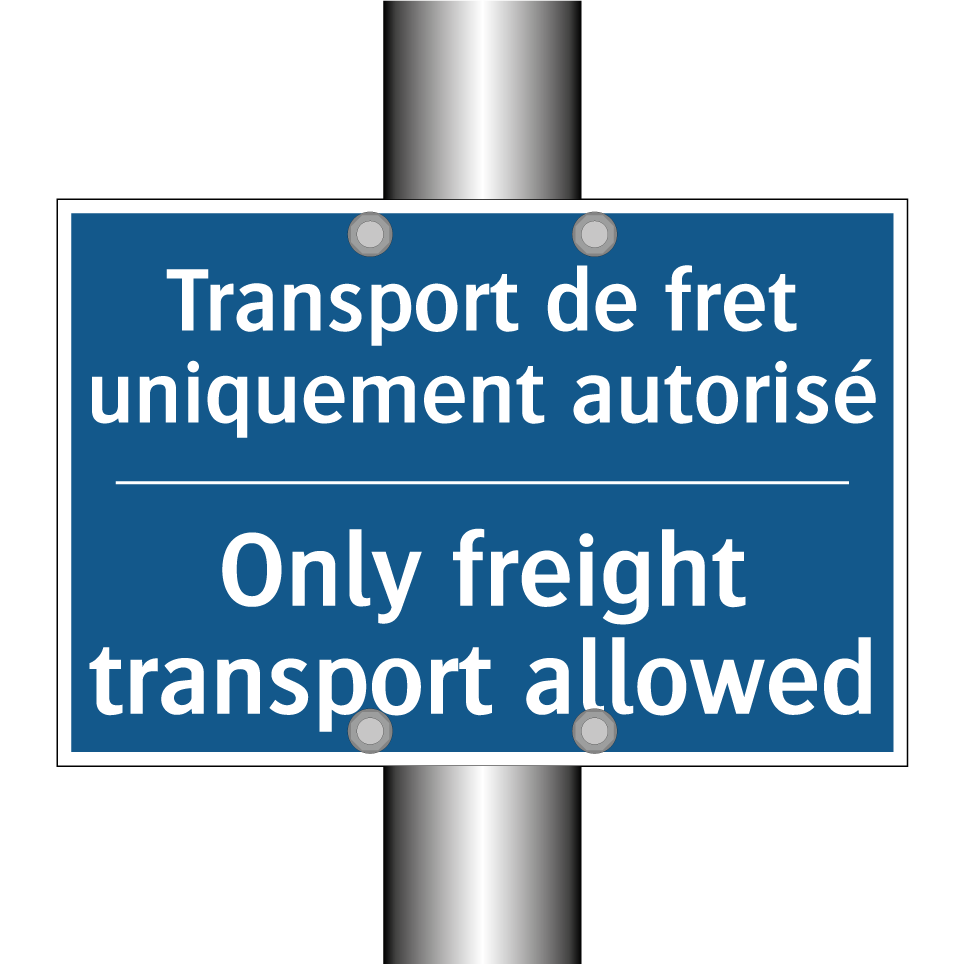 Panneau d'obligation bilingue avec texte en français : "Transport de fret uniquement autorisé", et en anglais : "Only freight transport allowed"