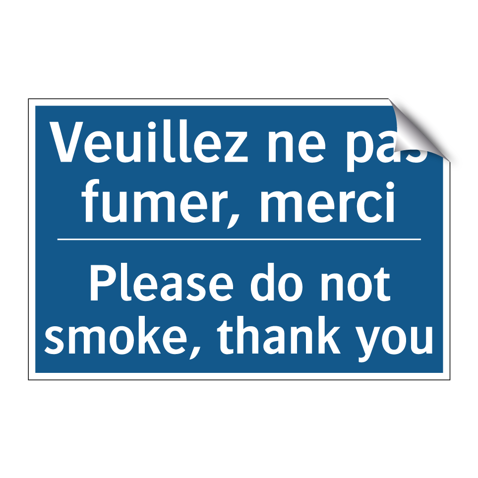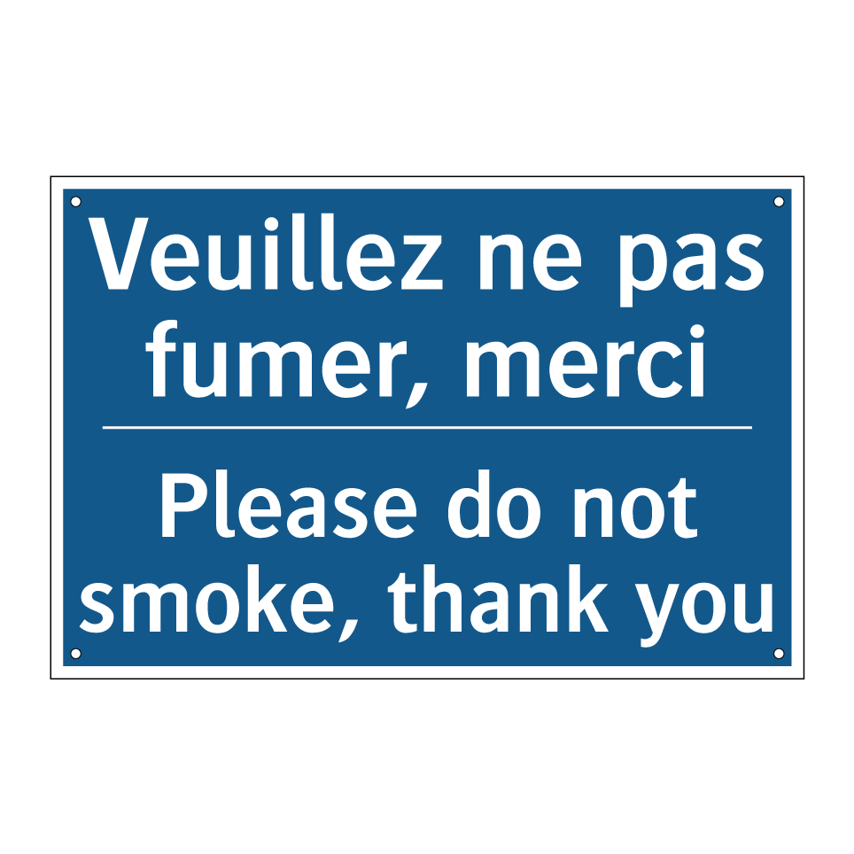 Panneau d'obligation bilingue avec texte en français : "Veuillez ne pas fumer, merci", et en anglais : "Please do not smoke, thank you"