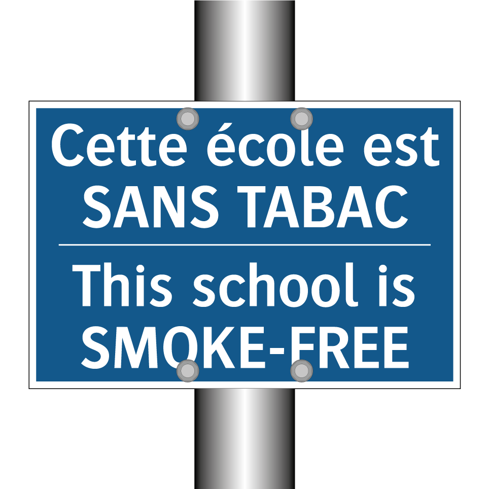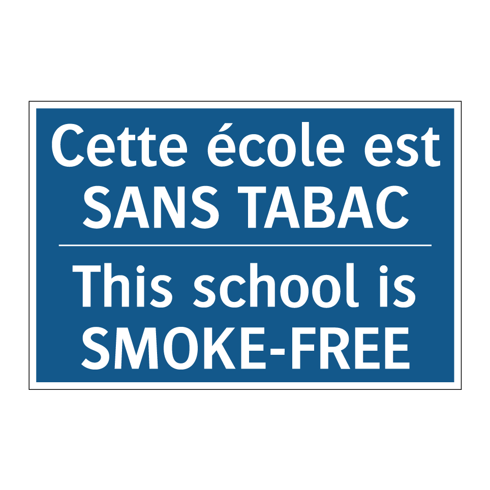 Panneau d'obligation bilingue avec texte en français : "Cette école est SANS TABAC", et en anglais : "This school is SMOKE-FREE"