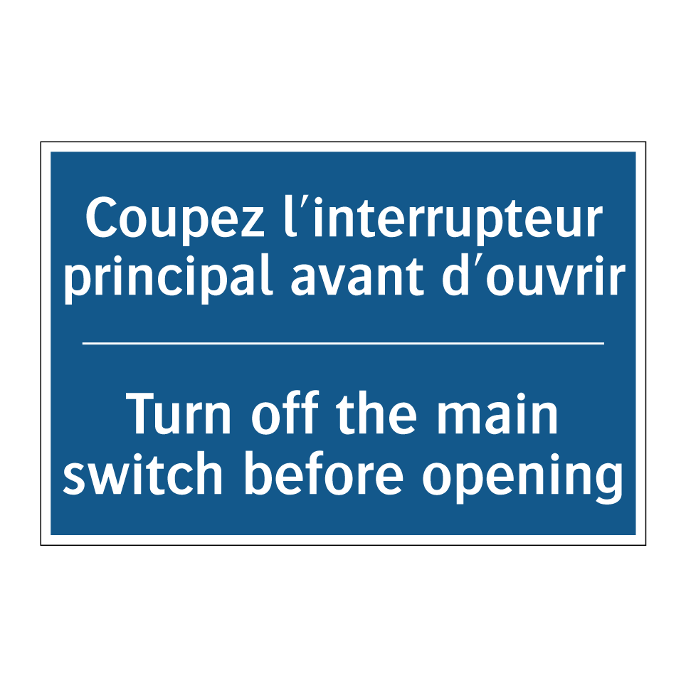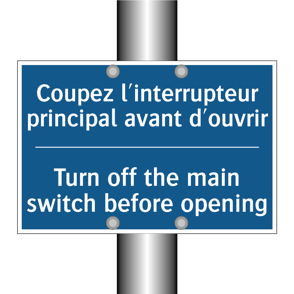 Panneau d'obligation bilingue avec texte en français : "Coupez l'interrupteur principal avant d'ouvrir", et en anglais : "Turn off the main switch before opening"
