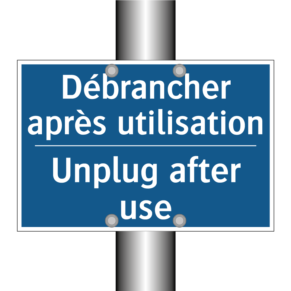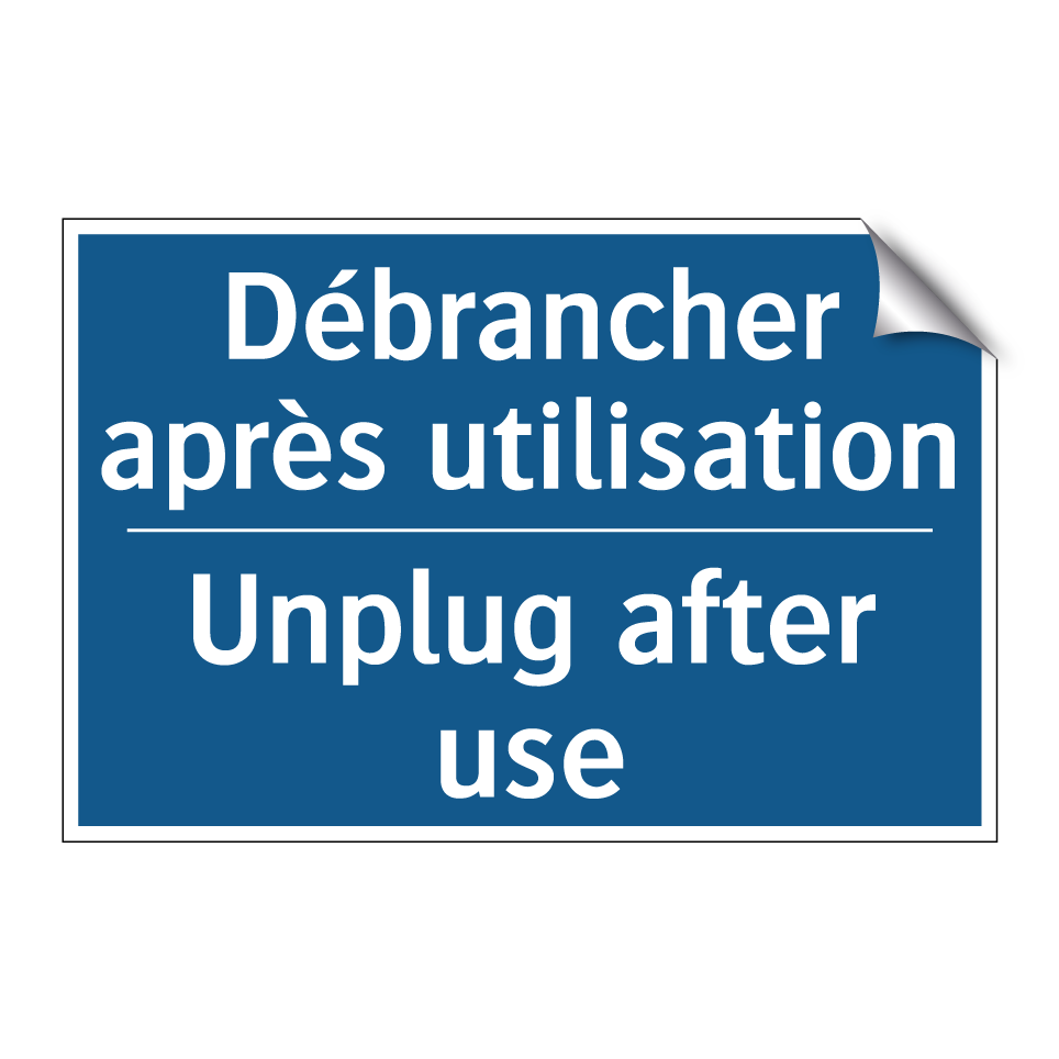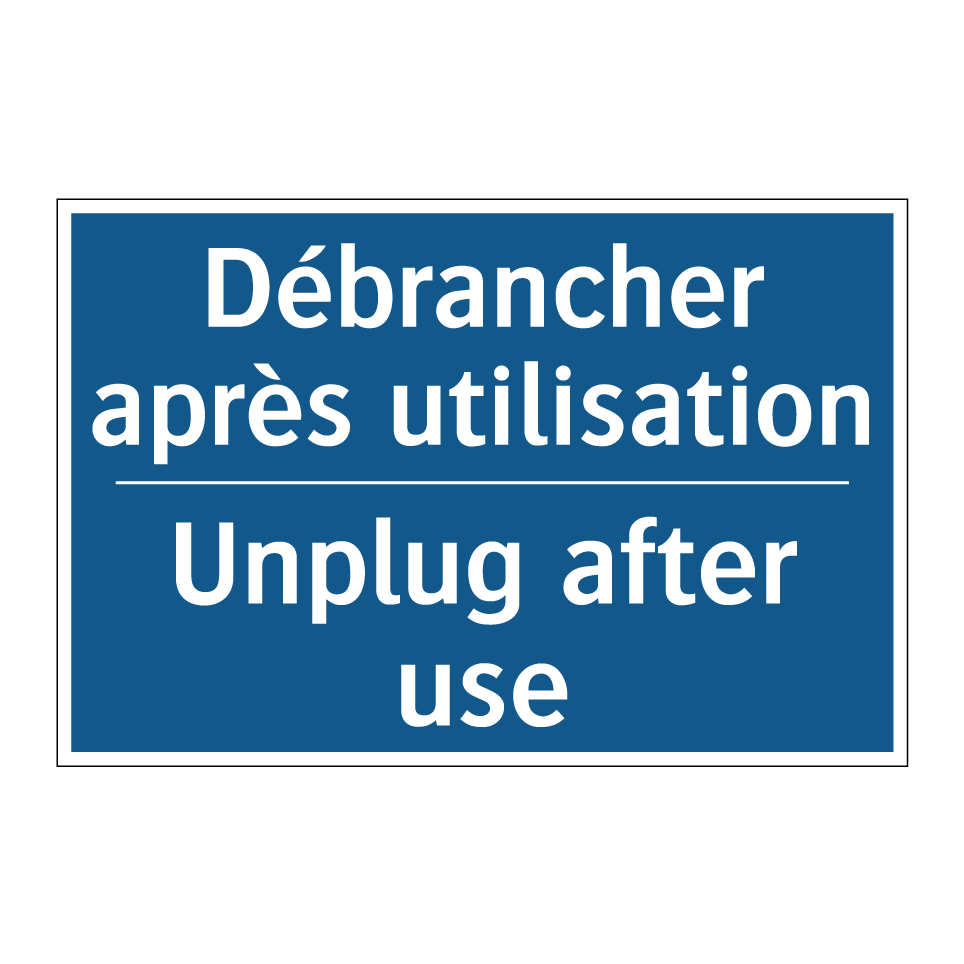 Panneau d'obligation bilingue avec texte en français : "Débrancher après utilisation", et en anglais : "Unplug after use"
