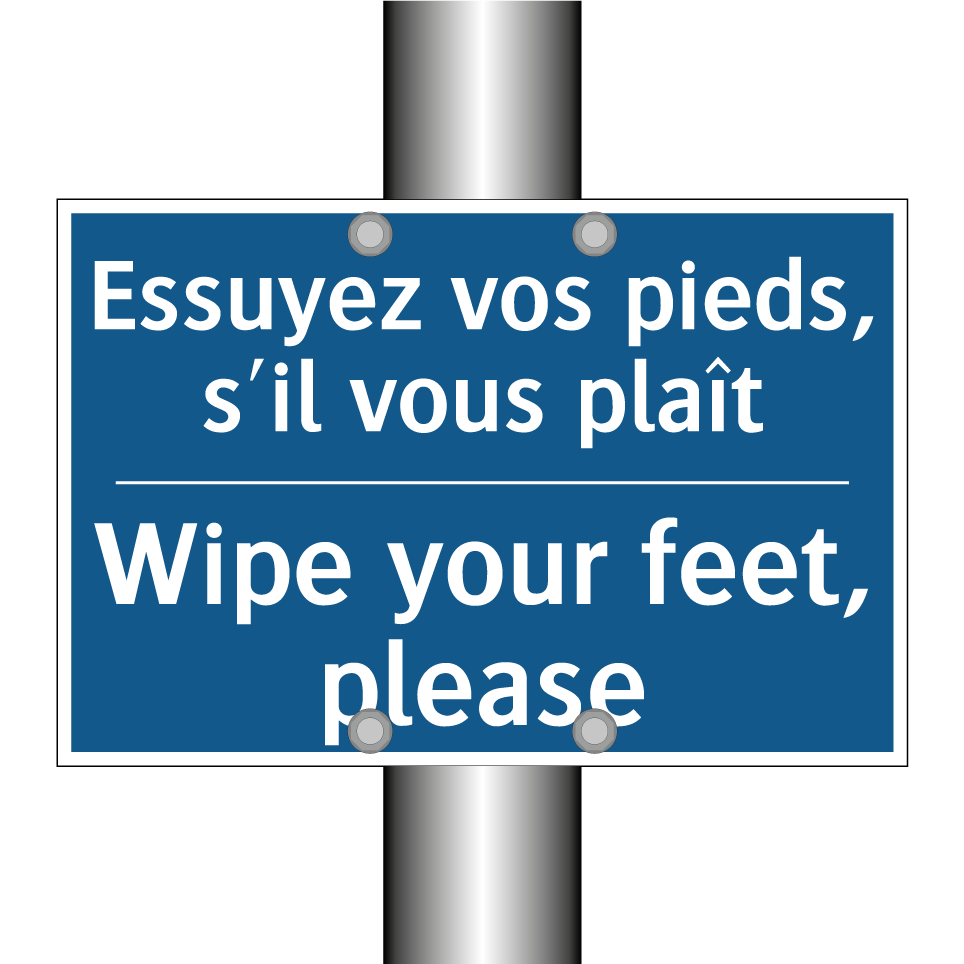 Panneau d'obligation bilingue avec texte en français : "Essuyez vos pieds, s'il vous plaît", et en anglais : "Wipe your feet, please"