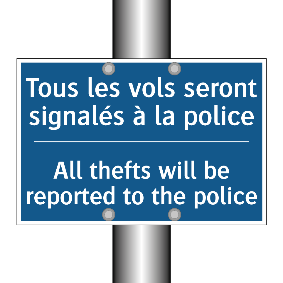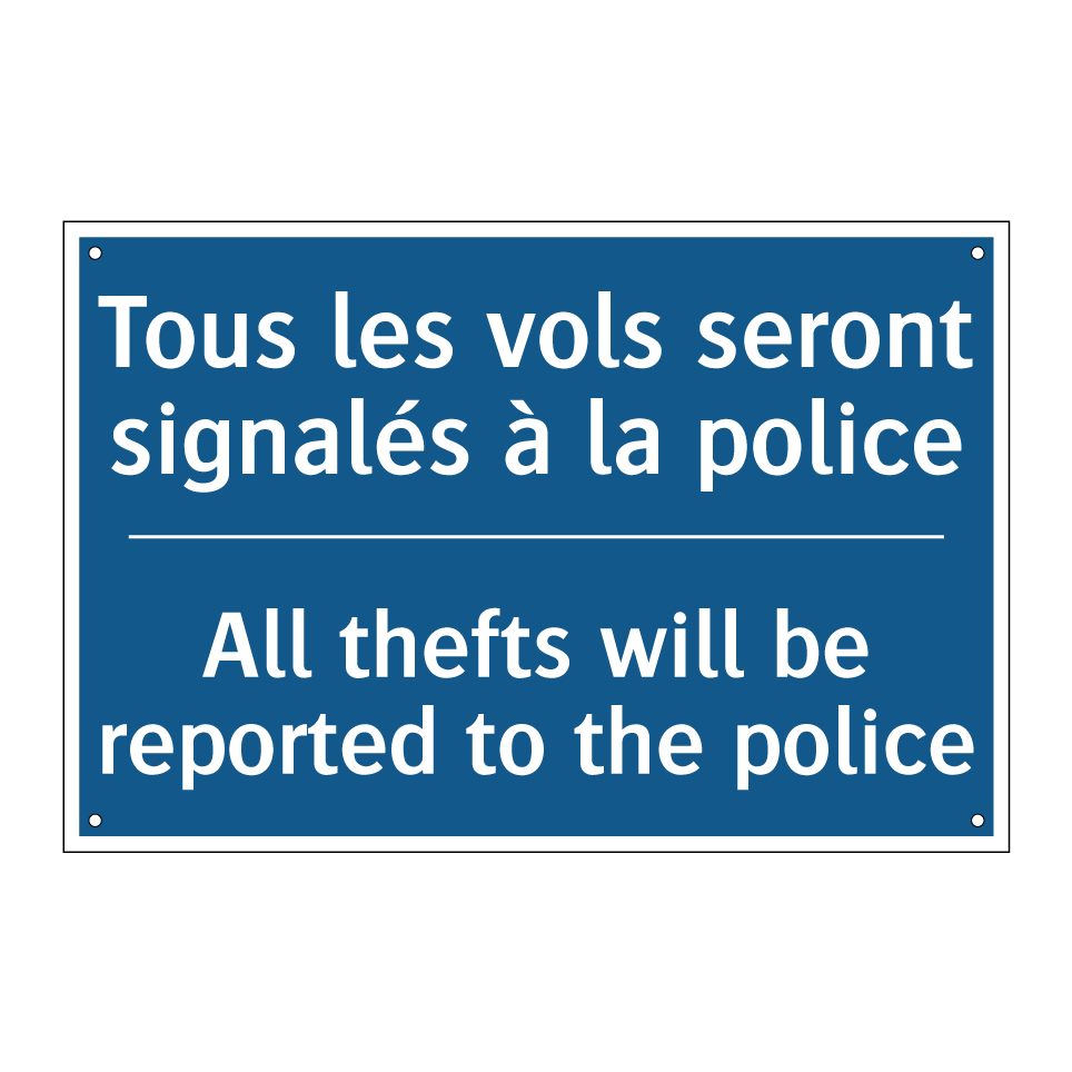 Panneau d'obligation bilingue avec texte en français : "Tous les vols seront signalés à la police", et en anglais : "All thefts will be reported to the police"