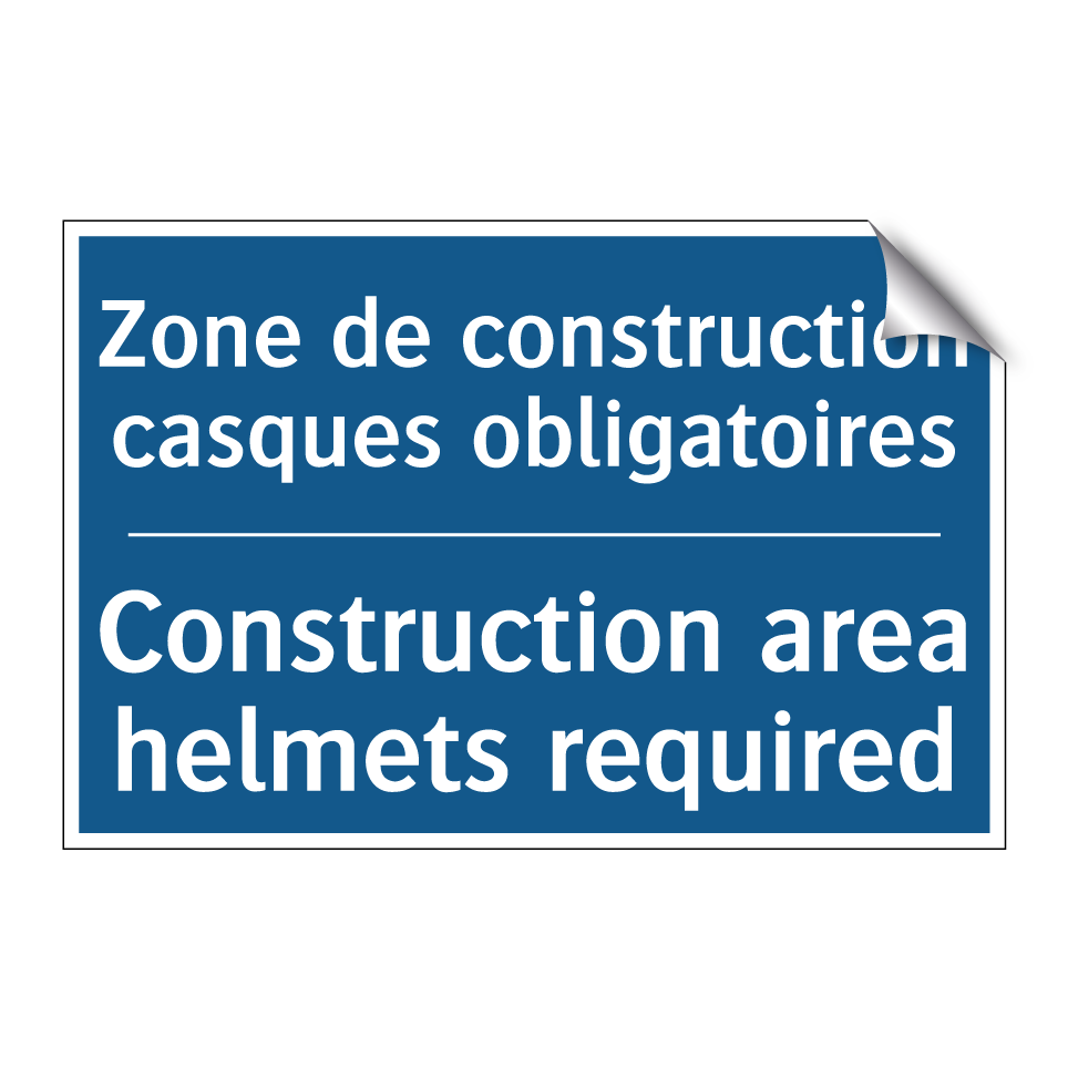 Panneau d'obligation bilingue avec texte en français : "Zone de construction casques obligatoires", et en anglais : "Construction area helmets required"