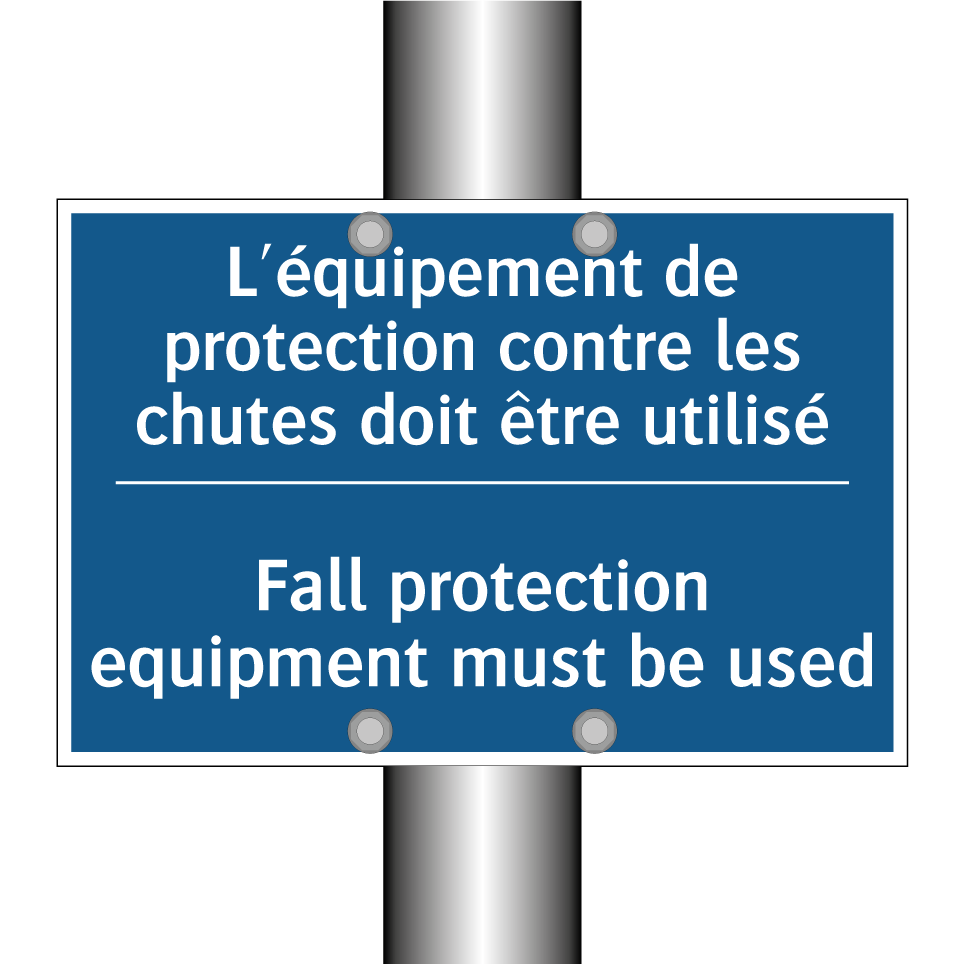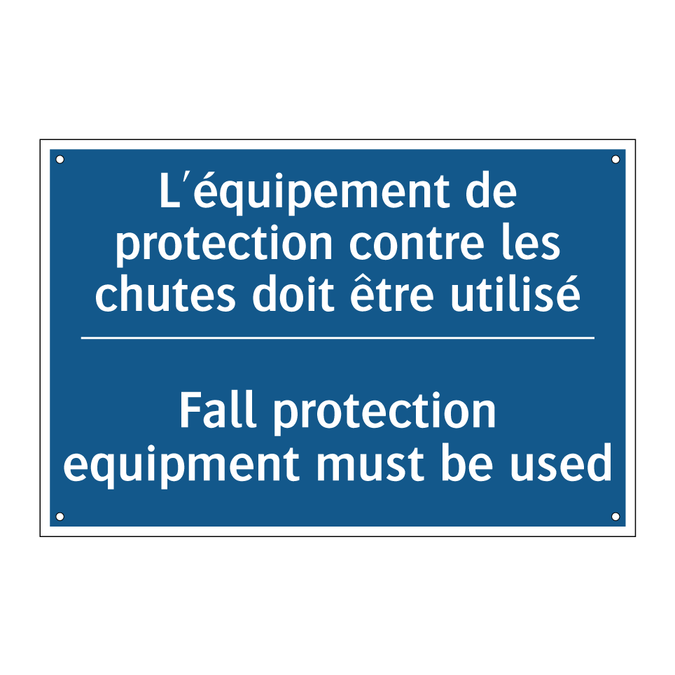 Panneau d'obligation bilingue avec texte en français : "L'équipement de protection contre les chutes doit être utilisé", et en anglais : "Fall protection equipment must be used"