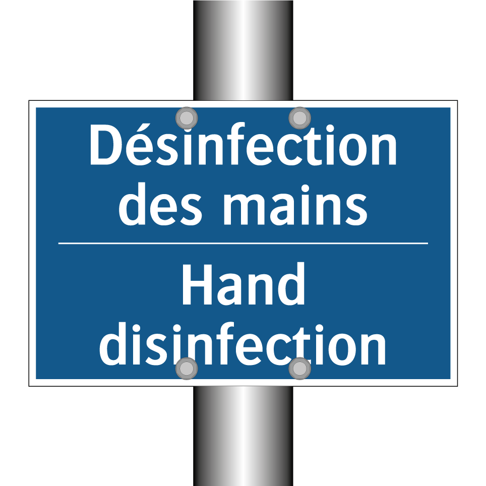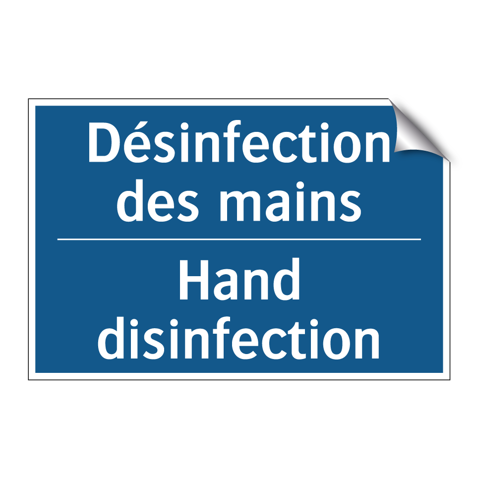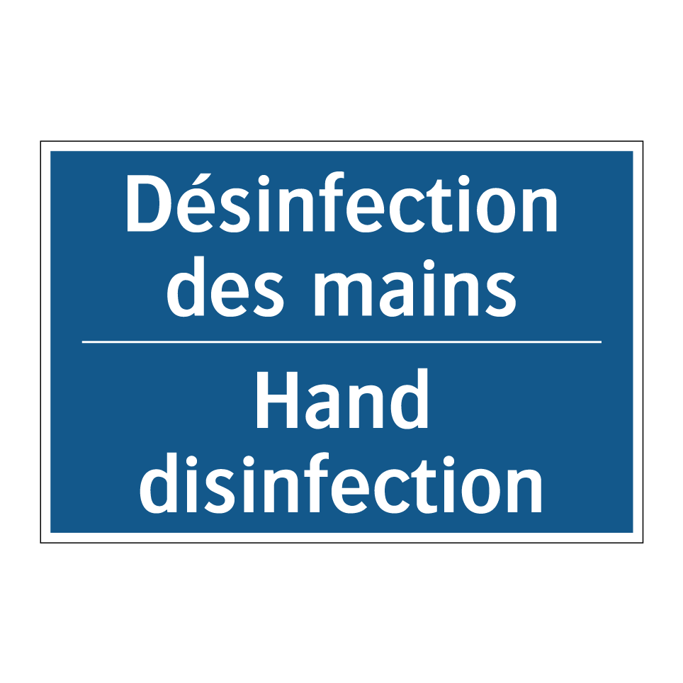Panneau d'obligation bilingue avec texte en français : "Désinfection des mains", et en anglais : "Hand disinfection"
