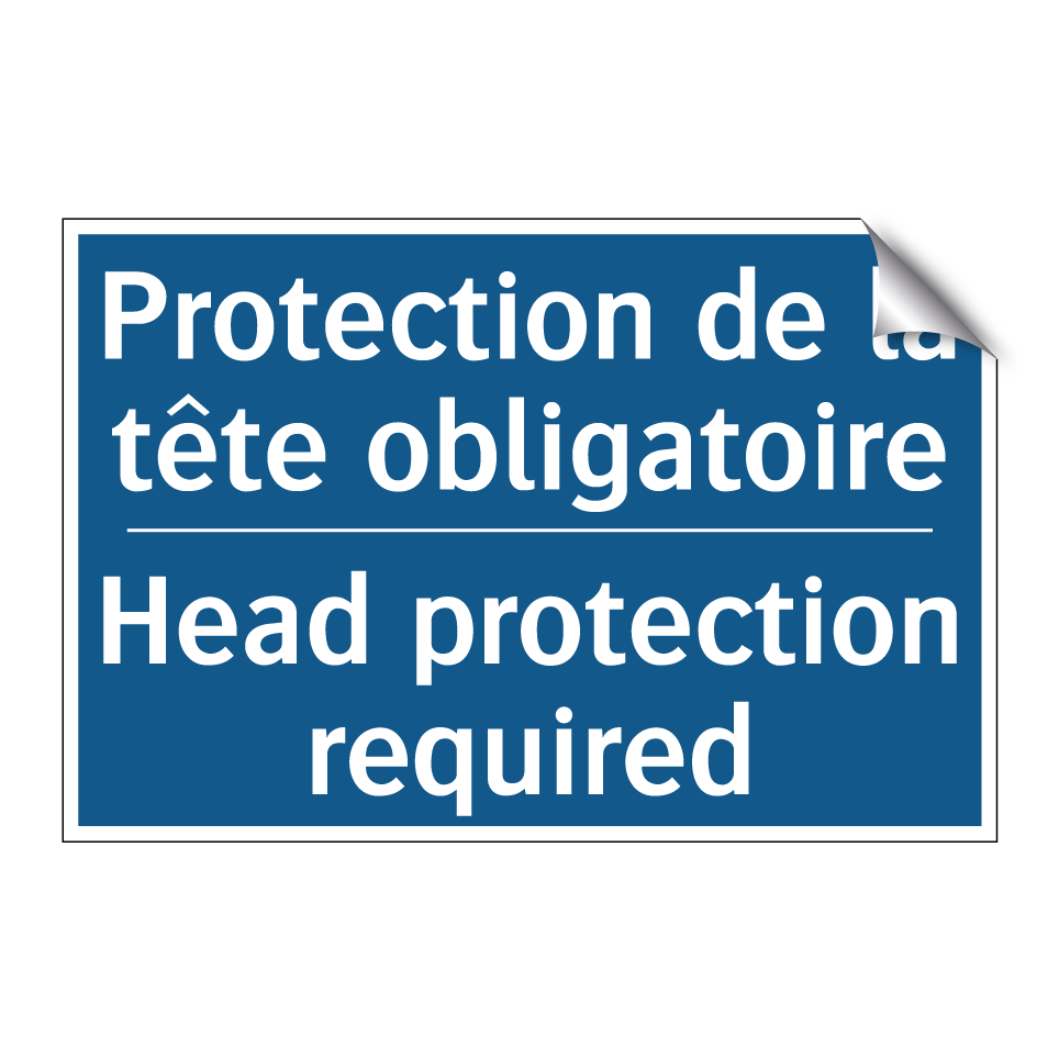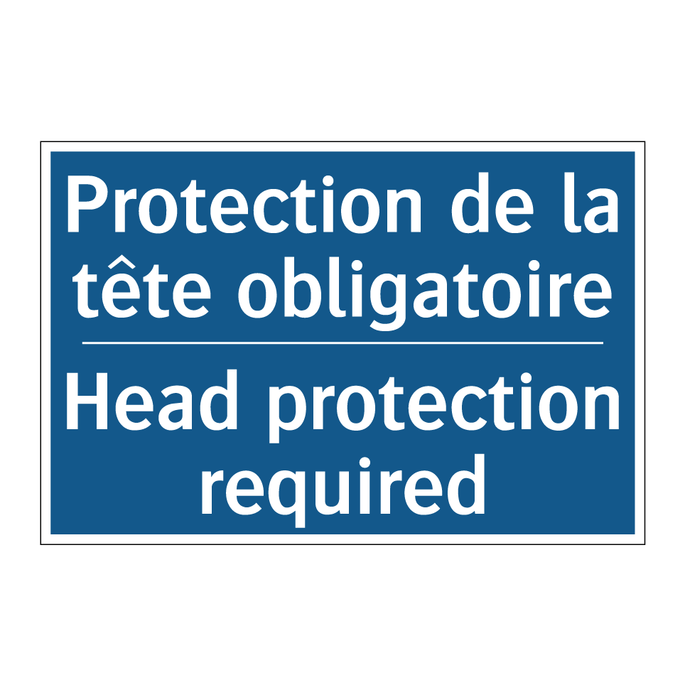 Panneau d'obligation bilingue avec texte en français : "Protection de la tête obligatoire", et en anglais : "Head protection required"