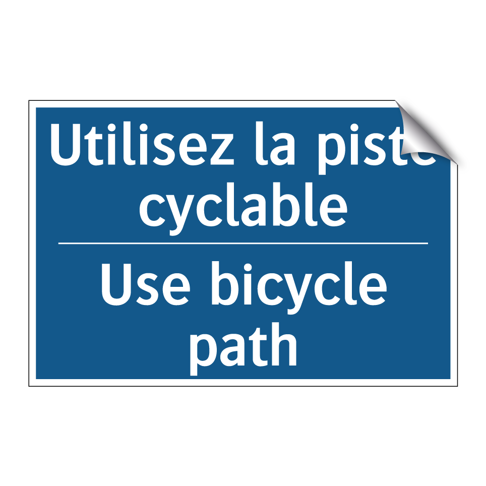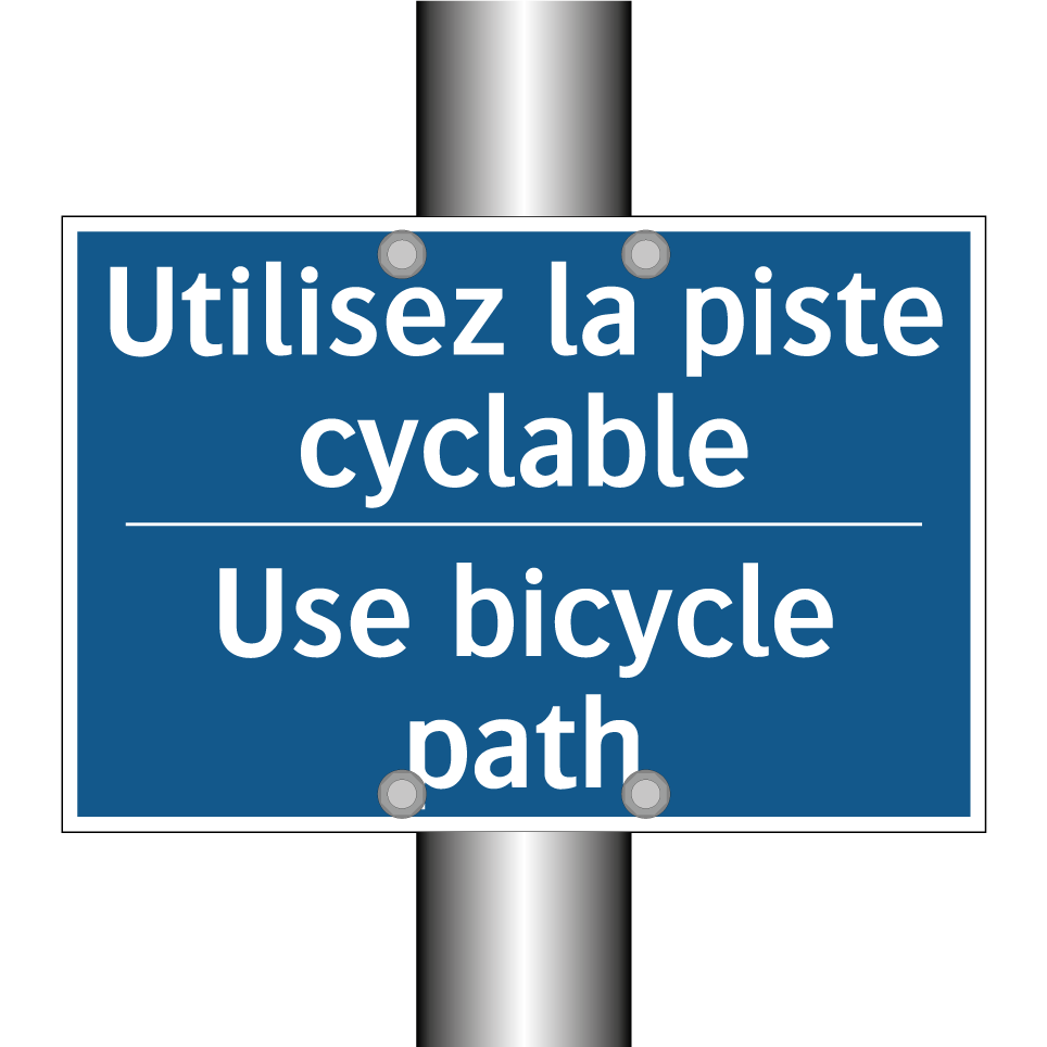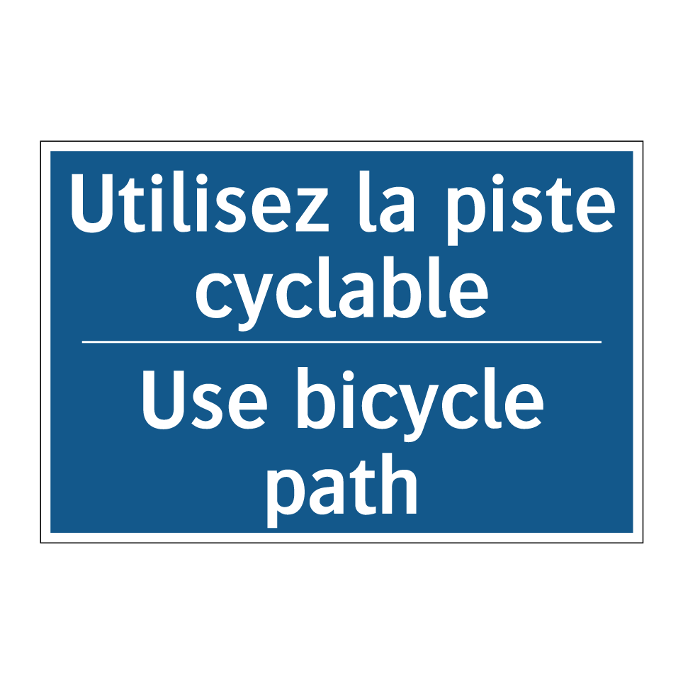 Panneau d'obligation bilingue avec texte en français : "Utilisez la piste cyclable", et en anglais : "Use bicycle path"