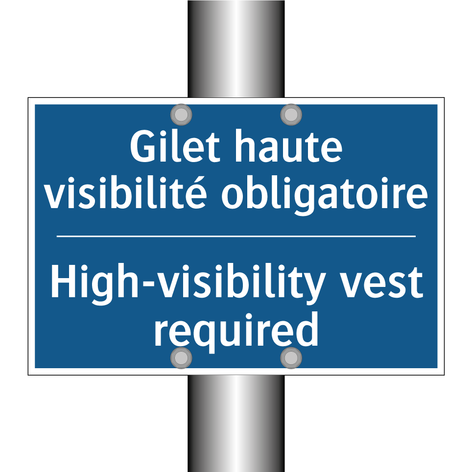 Panneau d'obligation bilingue avec texte en français : "Gilet haute visibilité obligatoire", et en anglais : "High-visibility vest required"