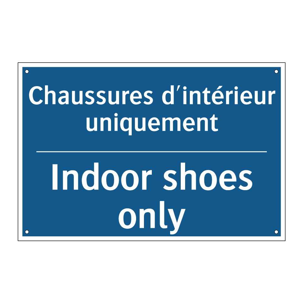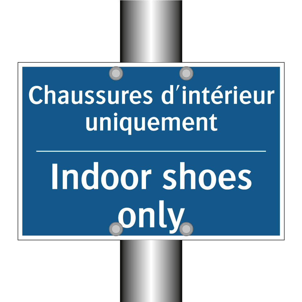 Panneau d'obligation bilingue avec texte en français : "Chaussures d'intérieur uniquement", et en anglais : "Indoor shoes only"