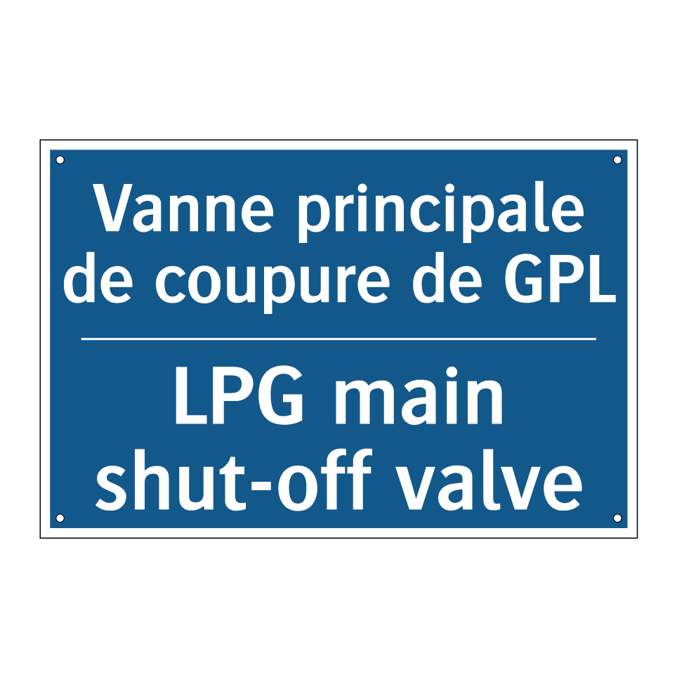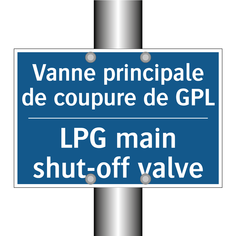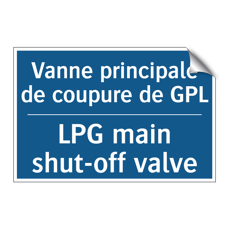 Panneau d'obligation bilingue avec texte en français : "Vanne principale de coupure de GPL", et en anglais : "LPG main shut-off valve"