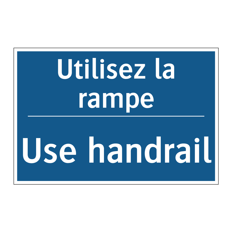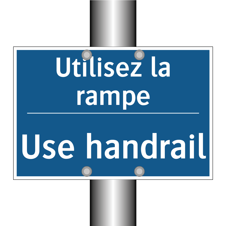 Panneau d'obligation bilingue avec texte en français : "Utilisez la rampe", et en anglais : "Use handrail"