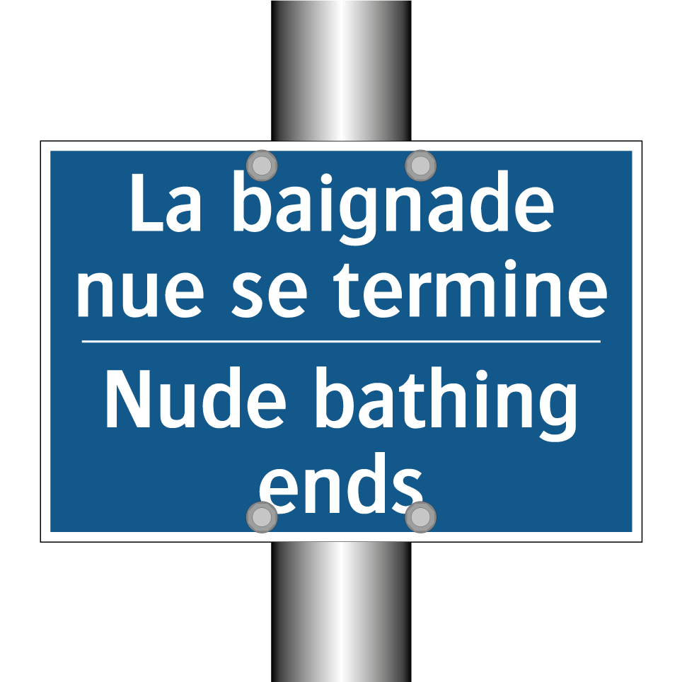 Panneau d'obligation bilingue avec texte en français : "La baignade nue se termine", et en anglais : "Nude bathing ends"