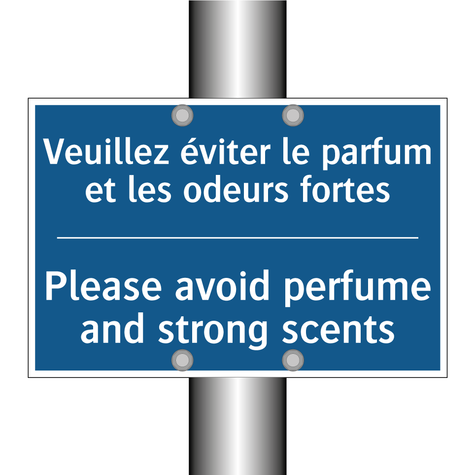 Panneau d'obligation bilingue avec texte en français : "Veuillez éviter le parfum et les odeurs fortes", et en anglais : "Please avoid perfume and strong scents"
