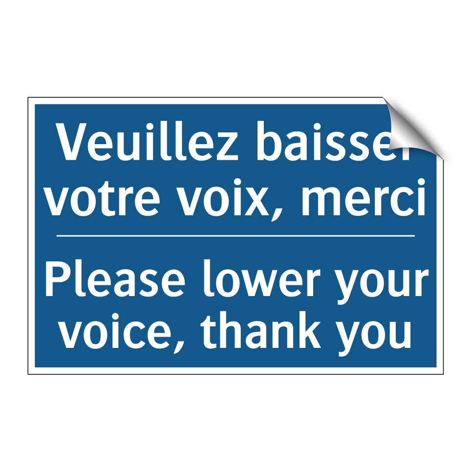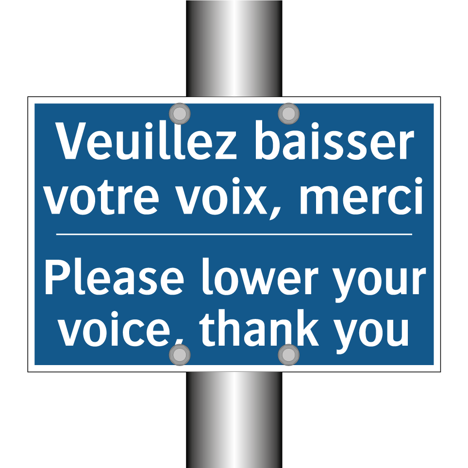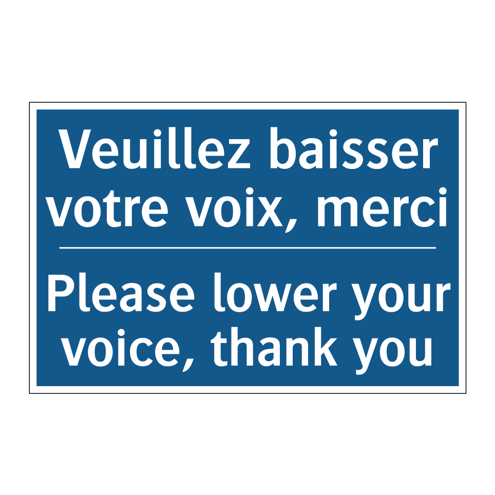 Panneau d'obligation bilingue avec texte en français : "Veuillez baisser votre voix, merci", et en anglais : "Please lower your voice, thank you"