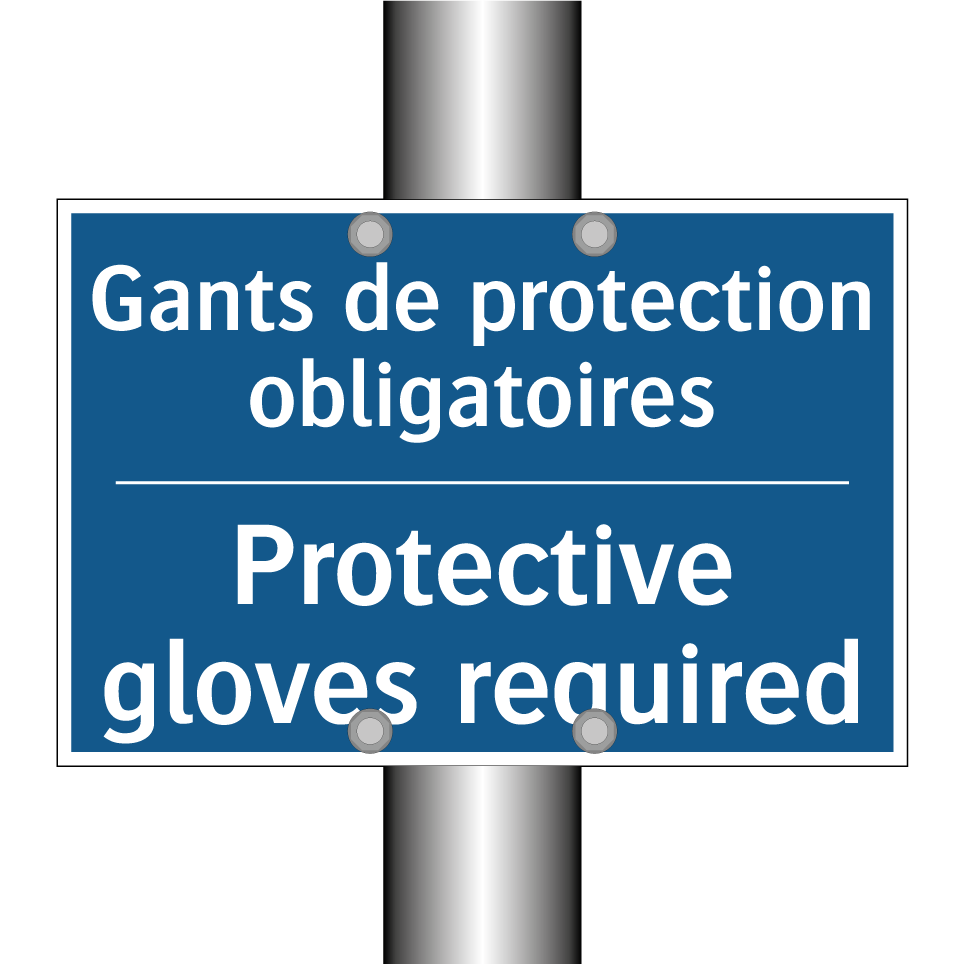 Panneau d'obligation bilingue avec texte en français : "Gants de protection obligatoires", et en anglais : "Protective gloves required"