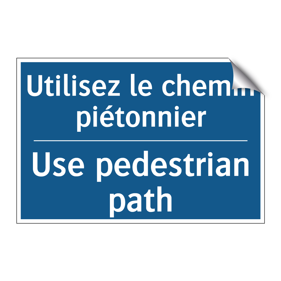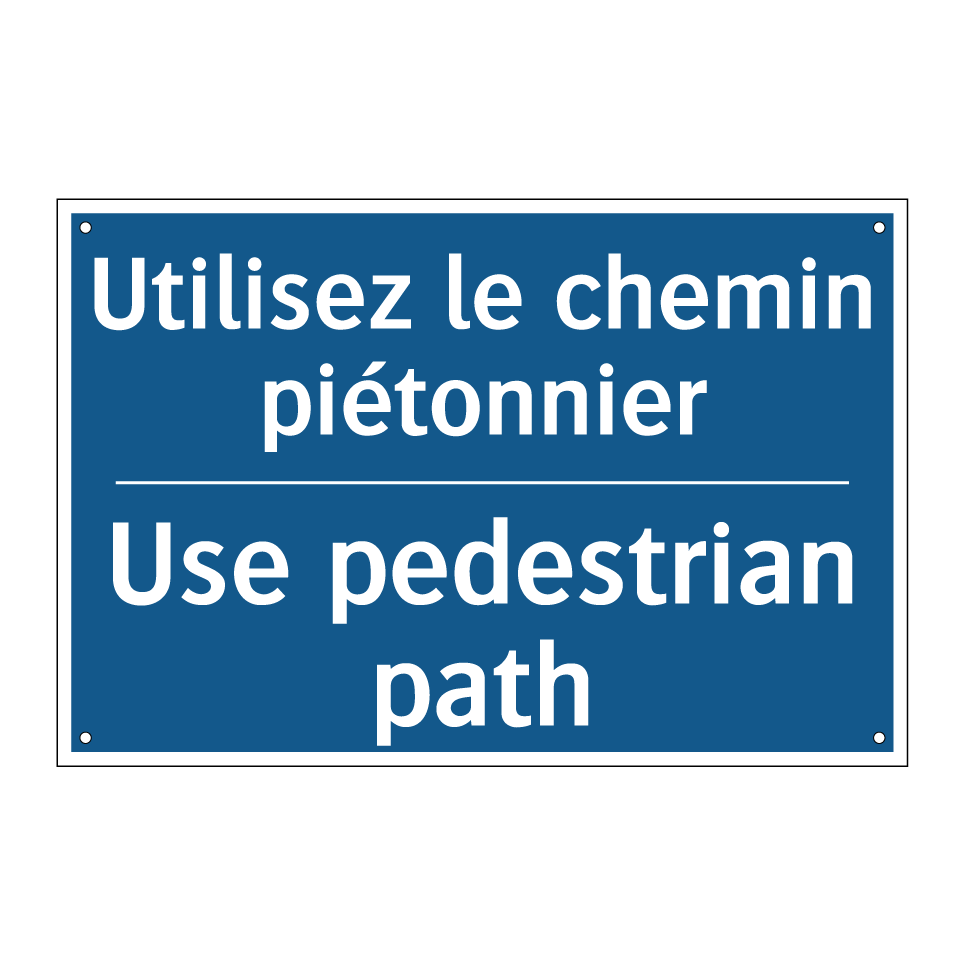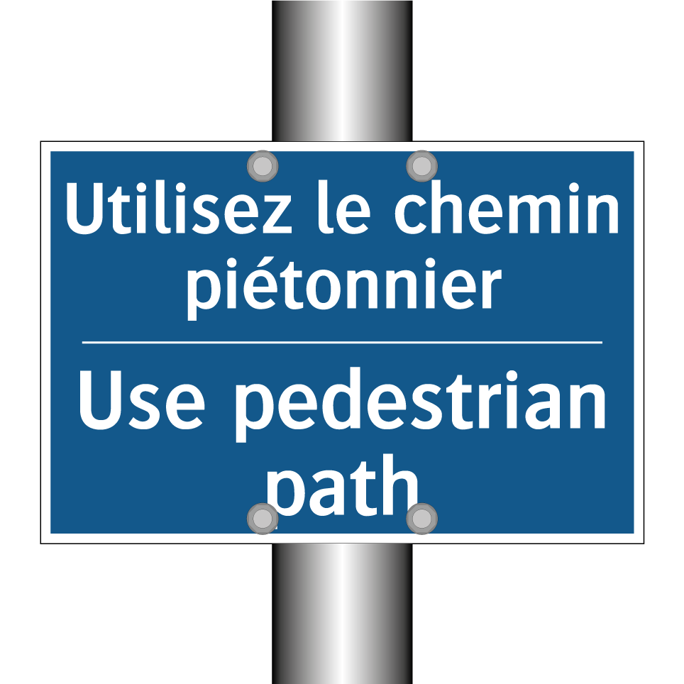 Panneau d'obligation bilingue avec texte en français : "Utilisez le chemin piétonnier", et en anglais : "Use pedestrian path"