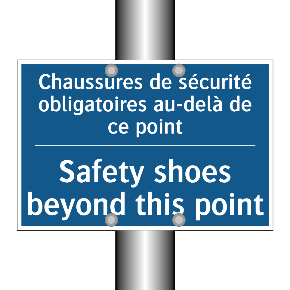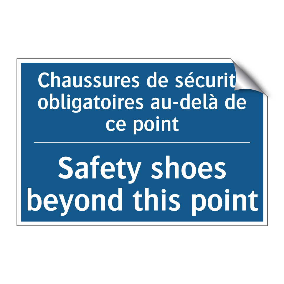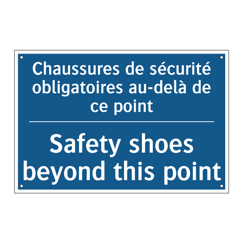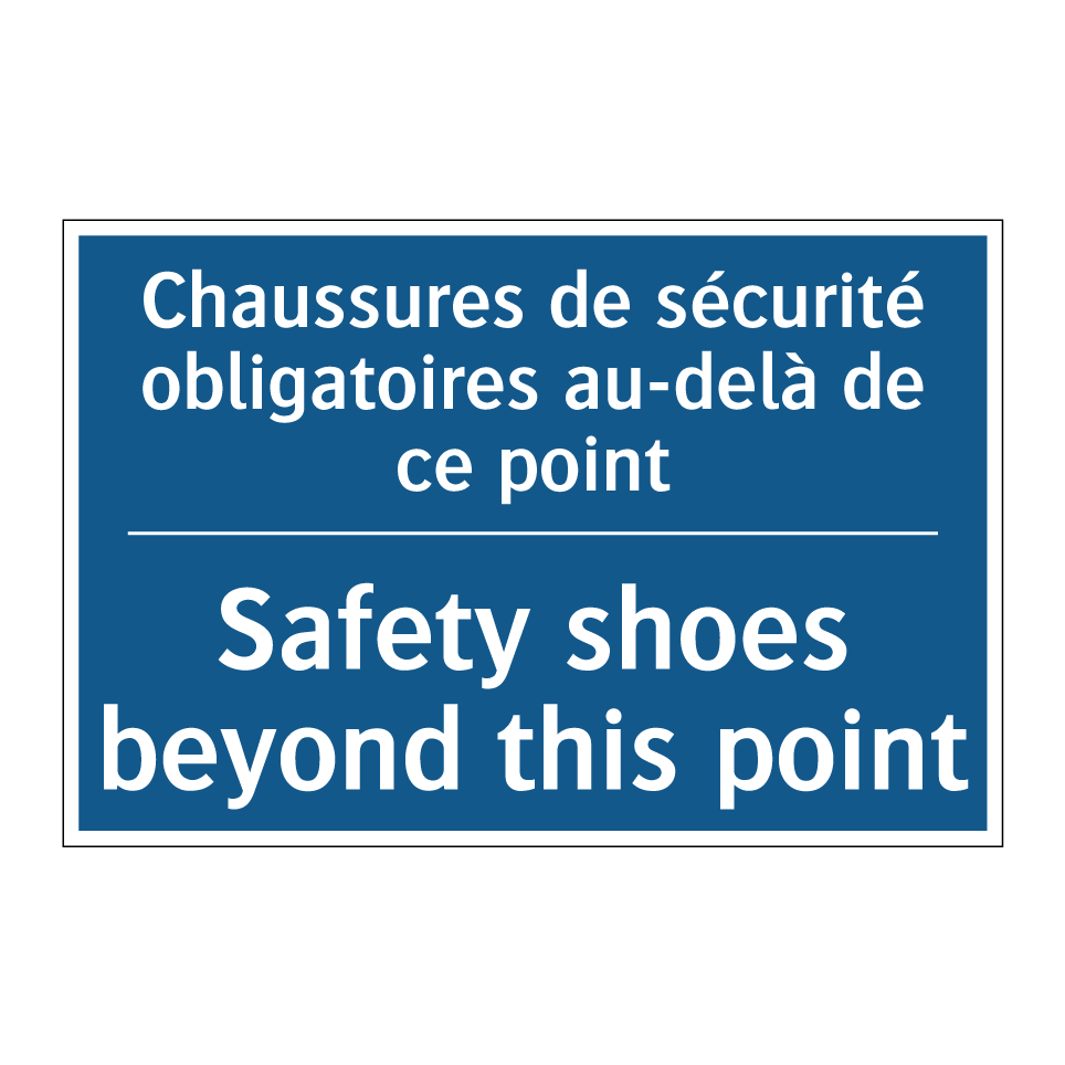 Panneau d'obligation bilingue avec texte en français : "Chaussures de sécurité obligatoires au-delà de ce point", et en anglais : "Safety shoes beyond this point"