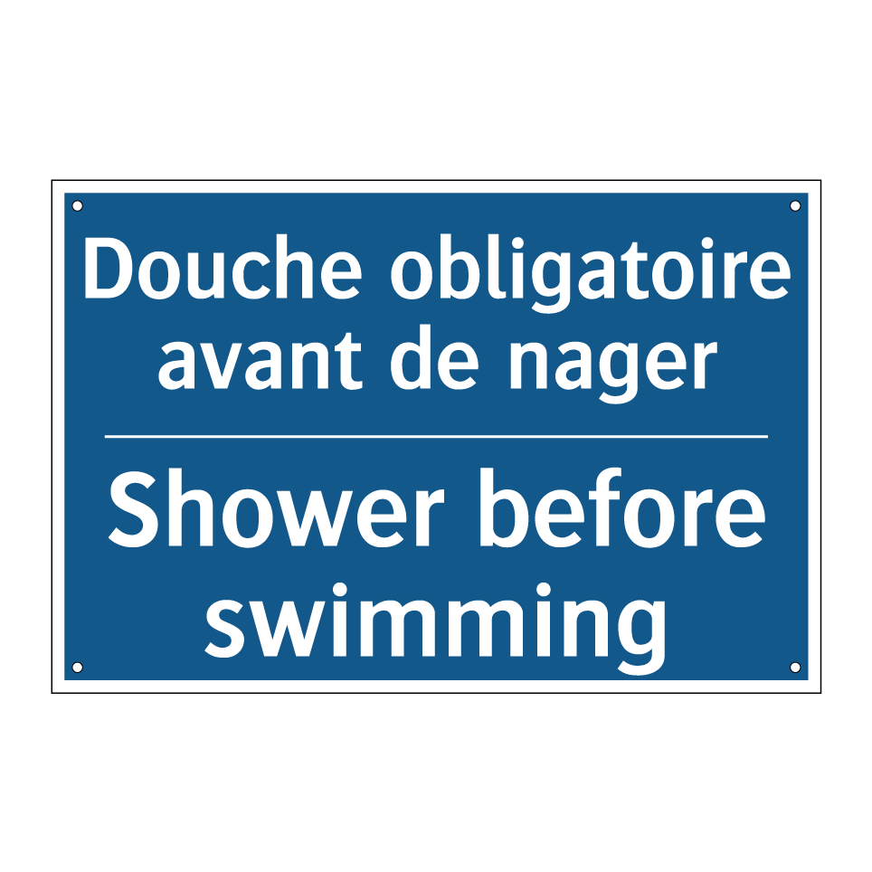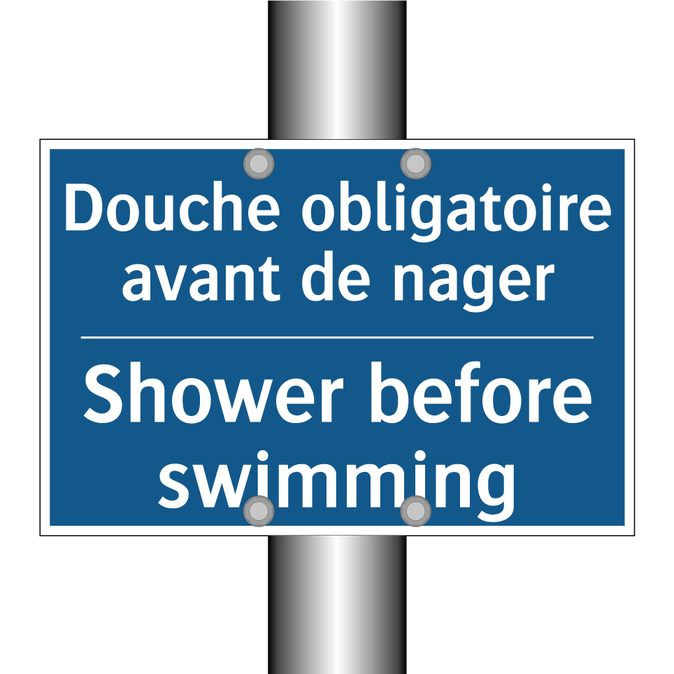 Panneau d'obligation bilingue avec texte en français : "Douche obligatoire avant de nager", et en anglais : "Shower before swimming"