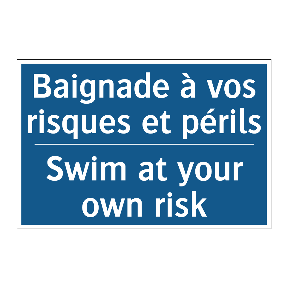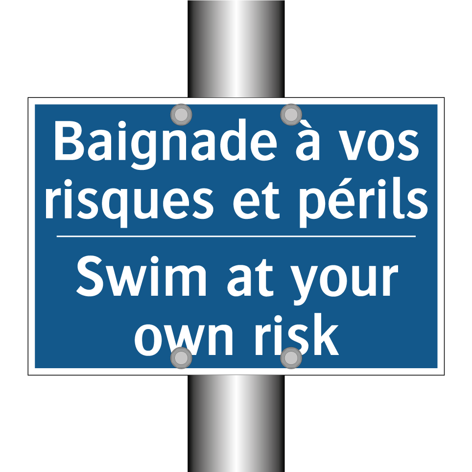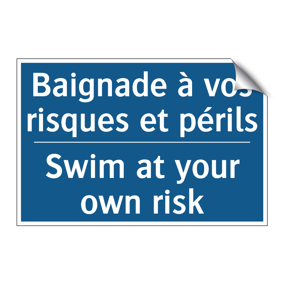 Panneau d'obligation bilingue avec texte en français : "Baignade à vos risques et périls", et en anglais : "Swim at your own risk"
