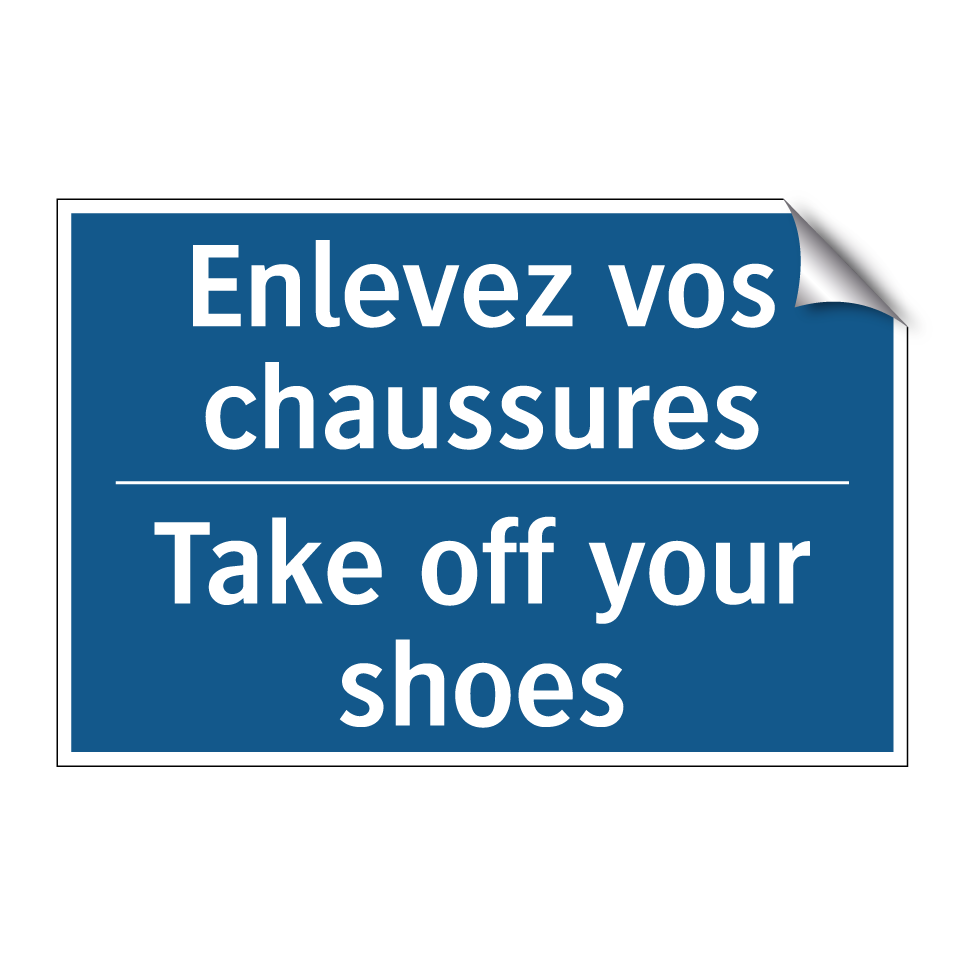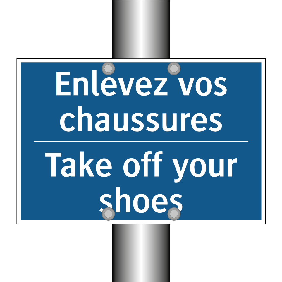 Panneau d'obligation bilingue avec texte en français : "Enlevez vos chaussures", et en anglais : "Take off your shoes"