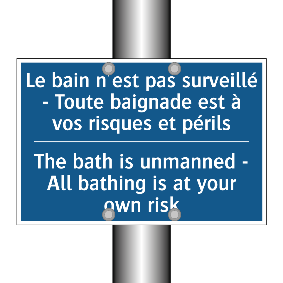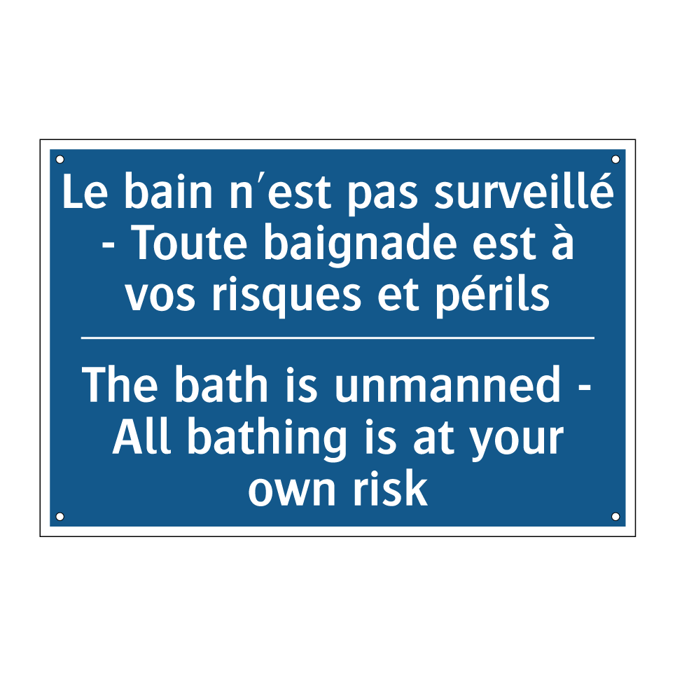 Panneau d'obligation bilingue avec texte en français : "Le bain n'est pas surveillé - Toute baignade est à vos risques et périls", et en anglais : "The bath is unmanned - All bathing is at your own risk"