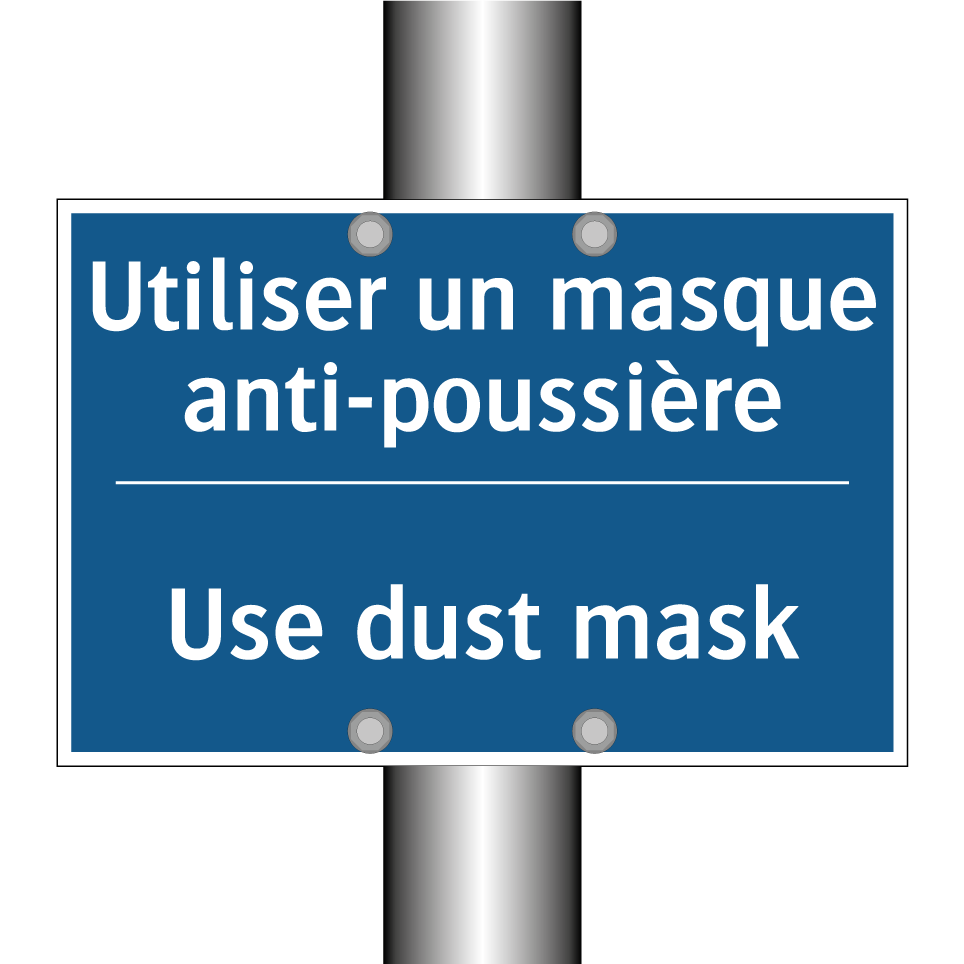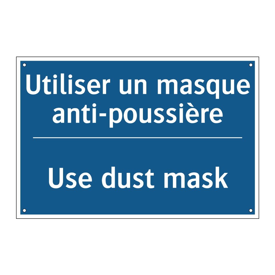 Panneau d'obligation bilingue avec texte en français : "Utiliser un masque anti-poussière", et en anglais : "Use dust mask"