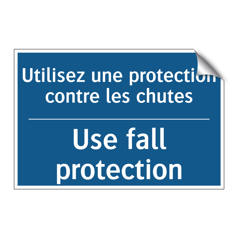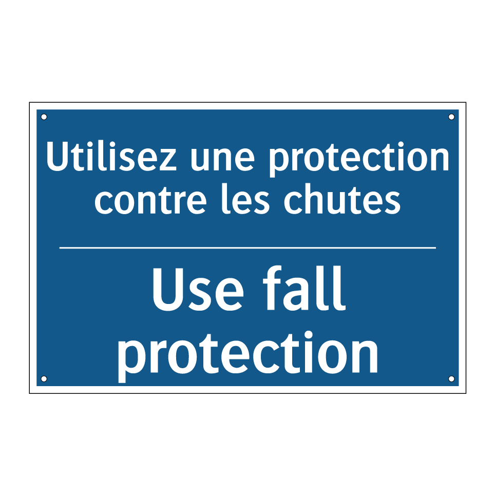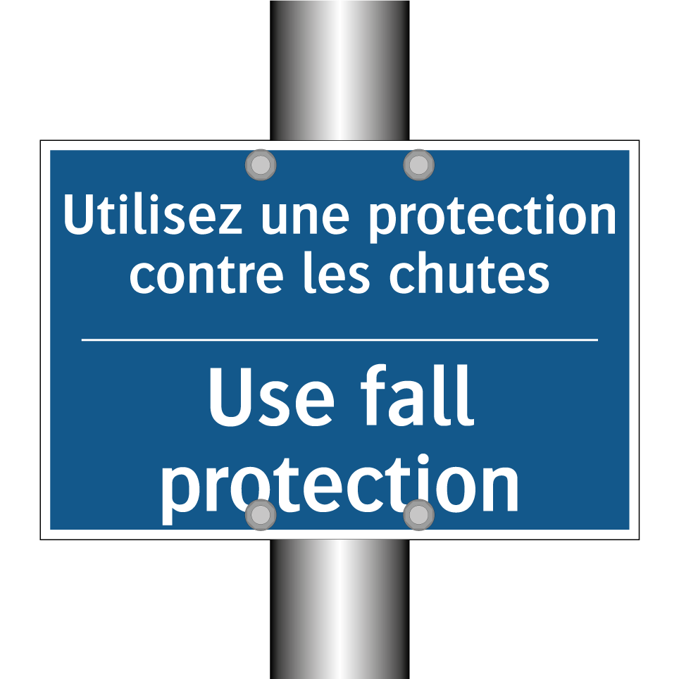 Panneau d'obligation bilingue avec texte en français : "Utilisez une protection contre les chutes", et en anglais : "Use fall protection"