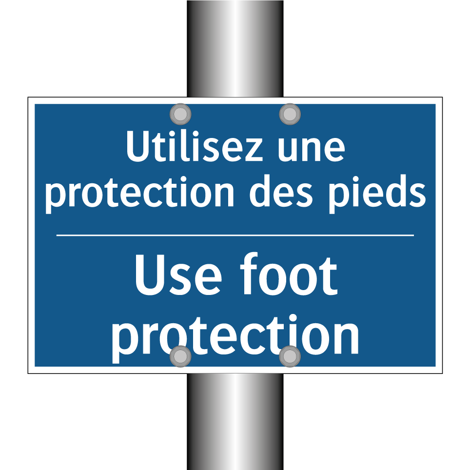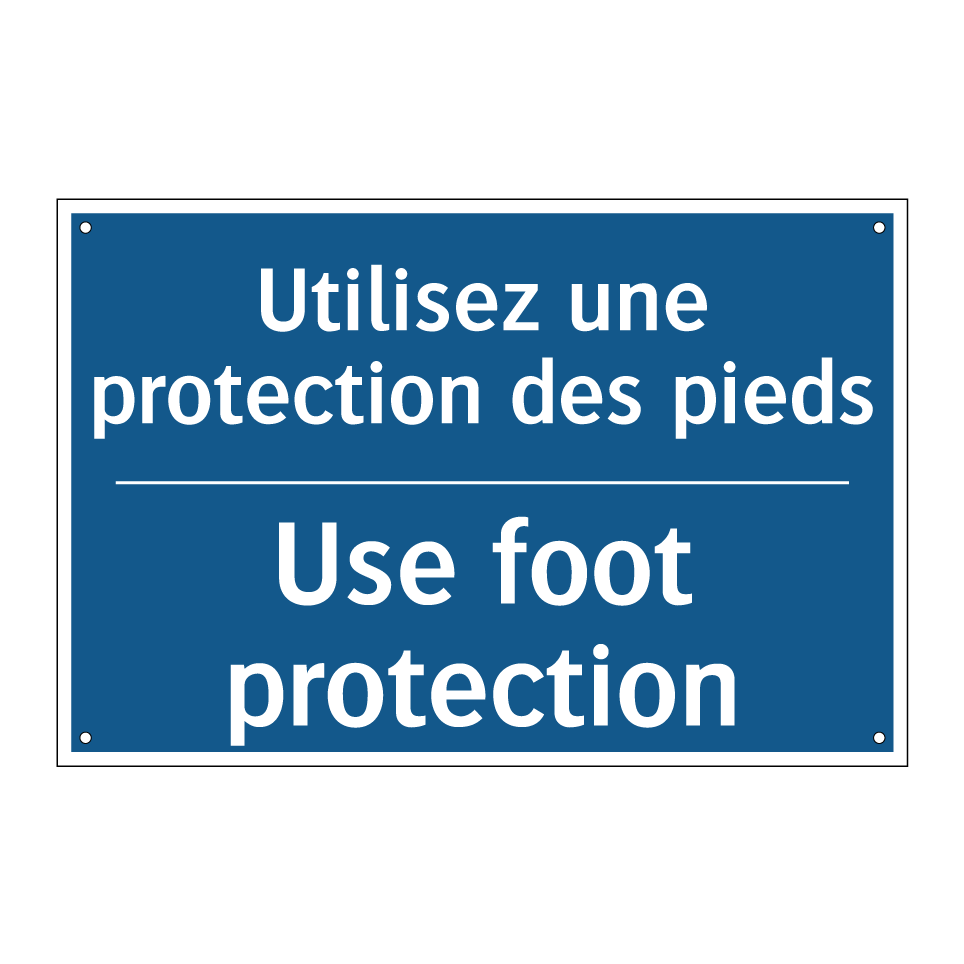Panneau d'obligation bilingue avec texte en français : "Utilisez une protection des pieds", et en anglais : "Use foot protection"