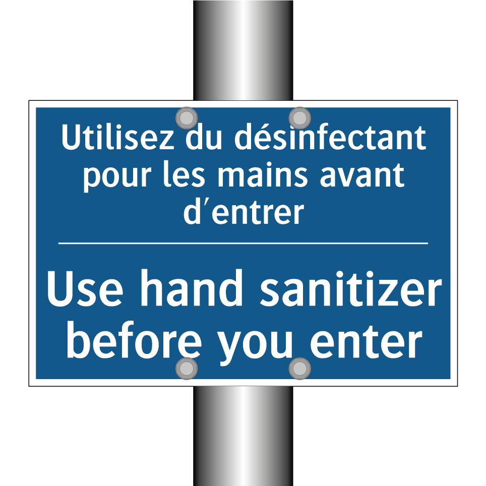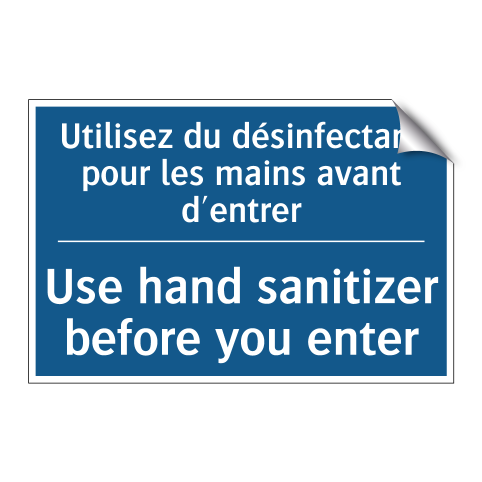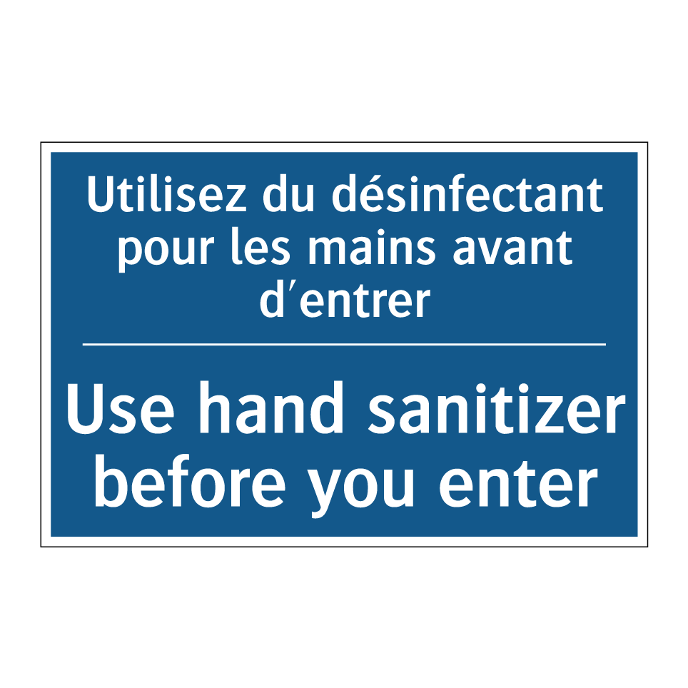 Panneau d'obligation bilingue avec texte en français : "Utilisez du désinfectant pour les mains avant d'entrer", et en anglais : "Use hand sanitizer before you enter"