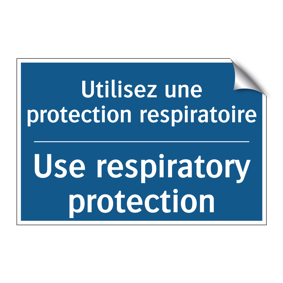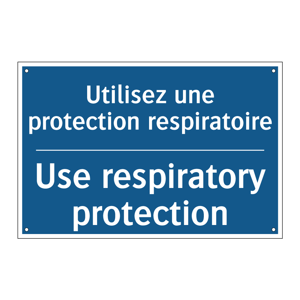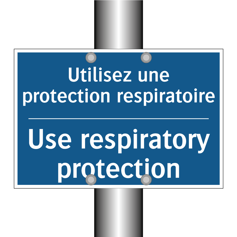 Panneau d'obligation bilingue avec texte en français : "Utilisez une protection respiratoire", et en anglais : "Use respiratory protection"