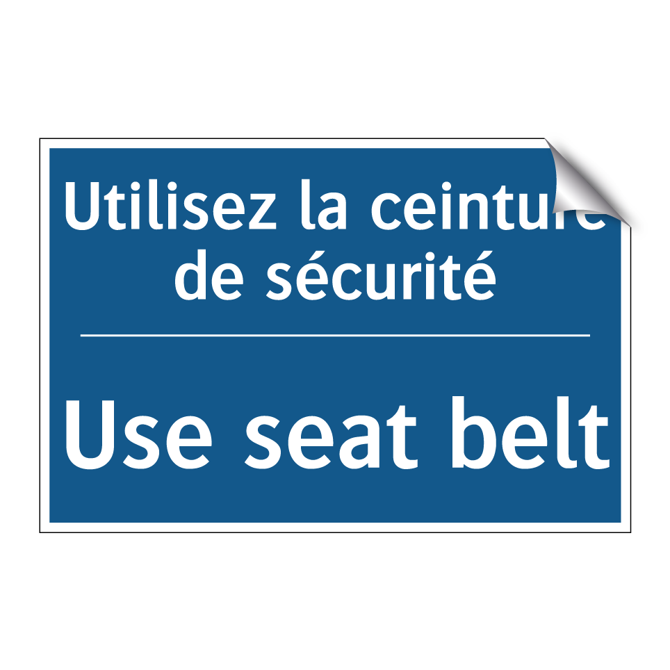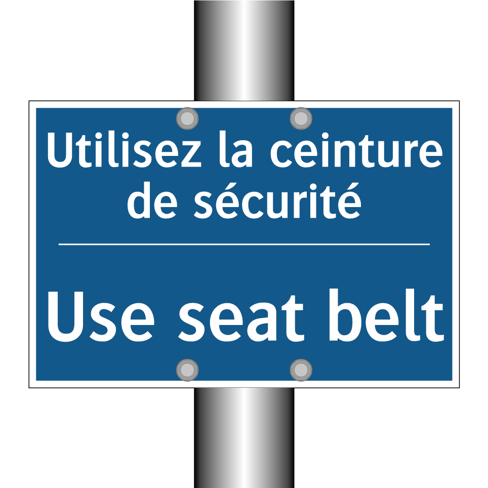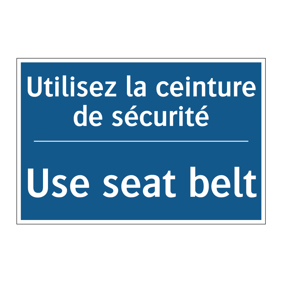 Panneau d'obligation bilingue avec texte en français : "Utilisez la ceinture de sécurité", et en anglais : "Use seat belt"