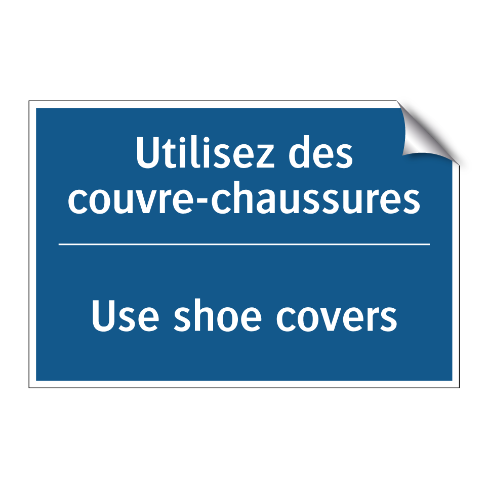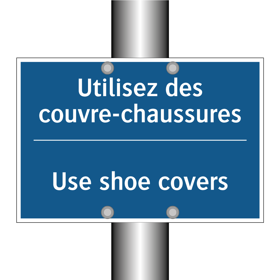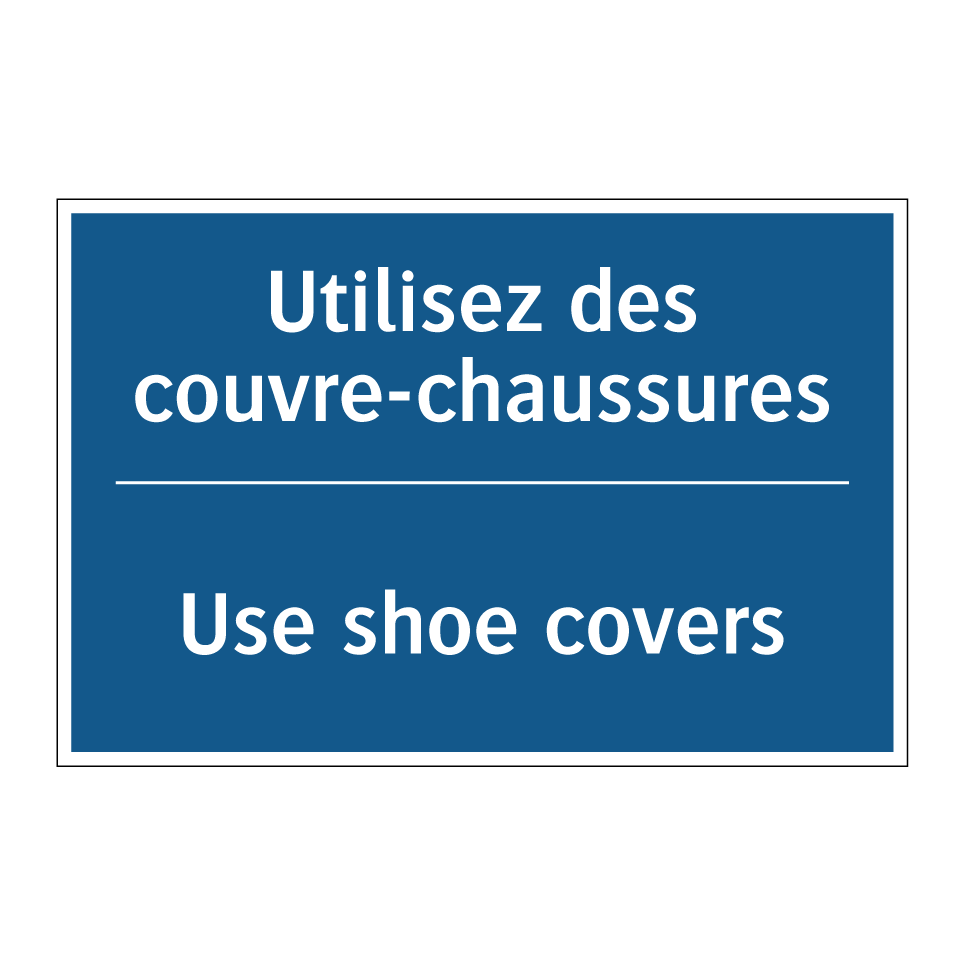 Panneau d'obligation bilingue avec texte en français : "Utilisez des couvre-chaussures", et en anglais : "Use shoe covers"