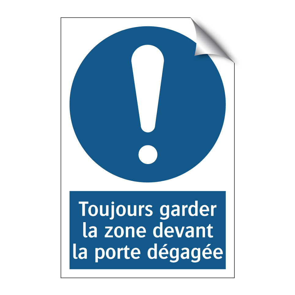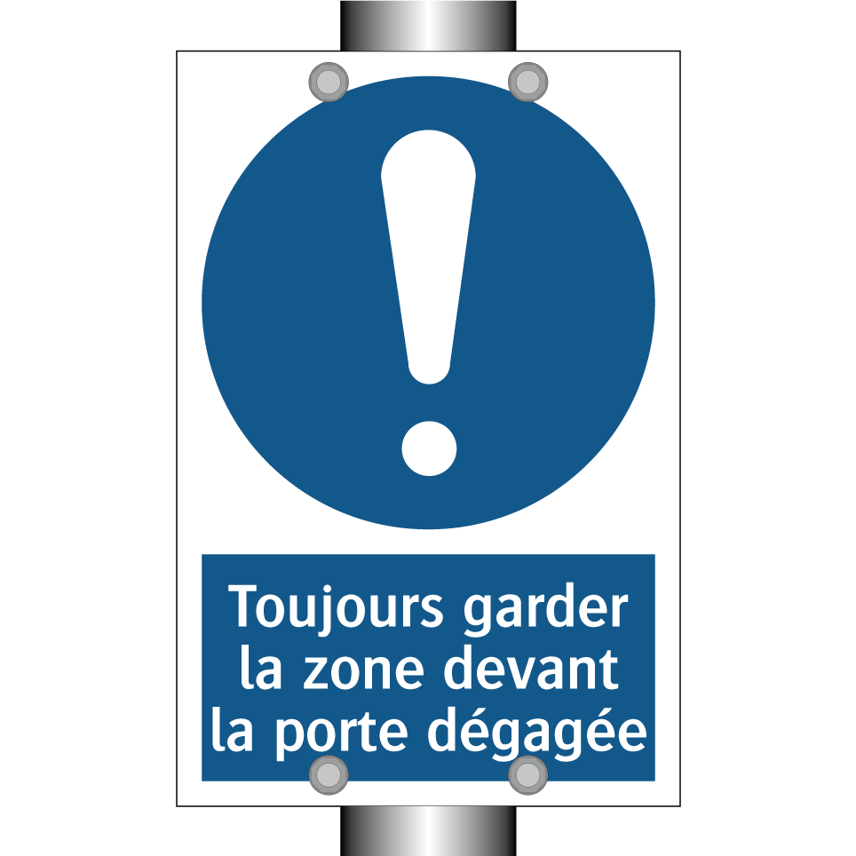 Panneau d'obligation avec le texte : "Toujours garder la zone devant la porte dégagée"