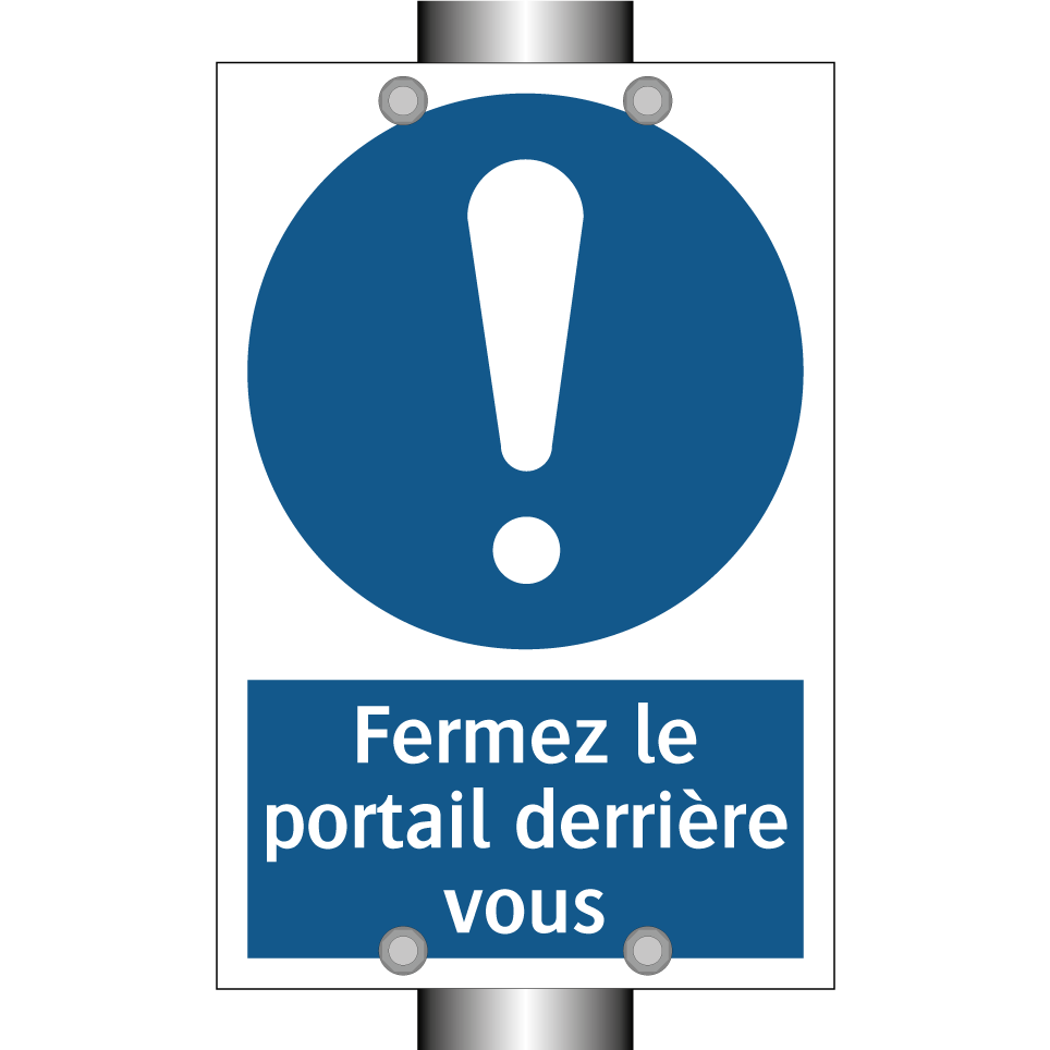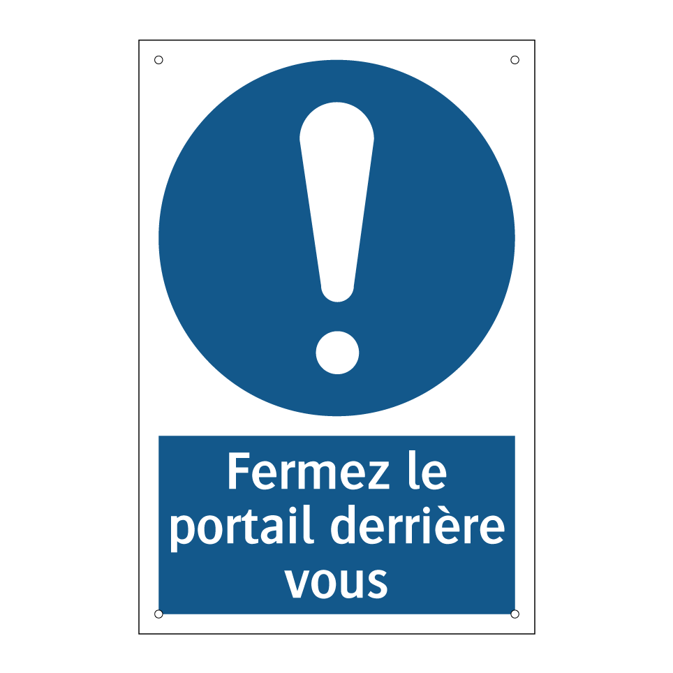 Panneau d'obligation avec le texte : "Fermez le portail derrière vous"